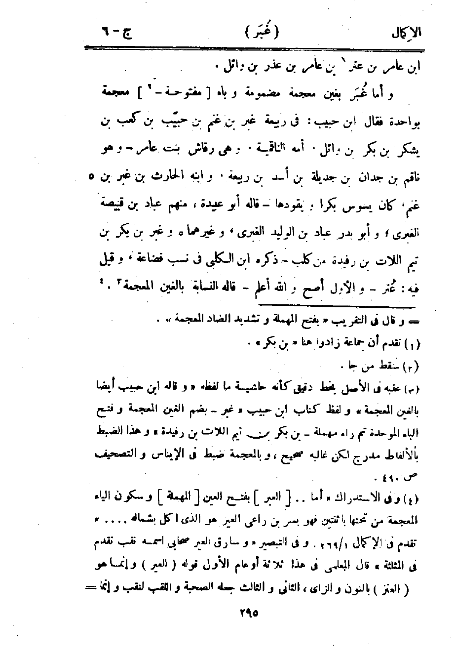 4 وفي الاستدراك "أما ... [العير] بفتح العين [المهملة] وسكون الياء المعجمة من تحتها باثنتين فهو بسر بن راعي العير, هو الذي أكل بشماله ... " تقدم في الإكمال 1/ 269. وفي التبصير "وسارق العير صحابي اسمه نقب, تقدم في المثلثة" قال المعلمي: في هذا ثلاثة أوهام؛ الأول قوله "العير" وإنما هو "العنز" بالنون والزاي، الثاني والثالث جعله الصحبة واللقب لنقب وإنما =