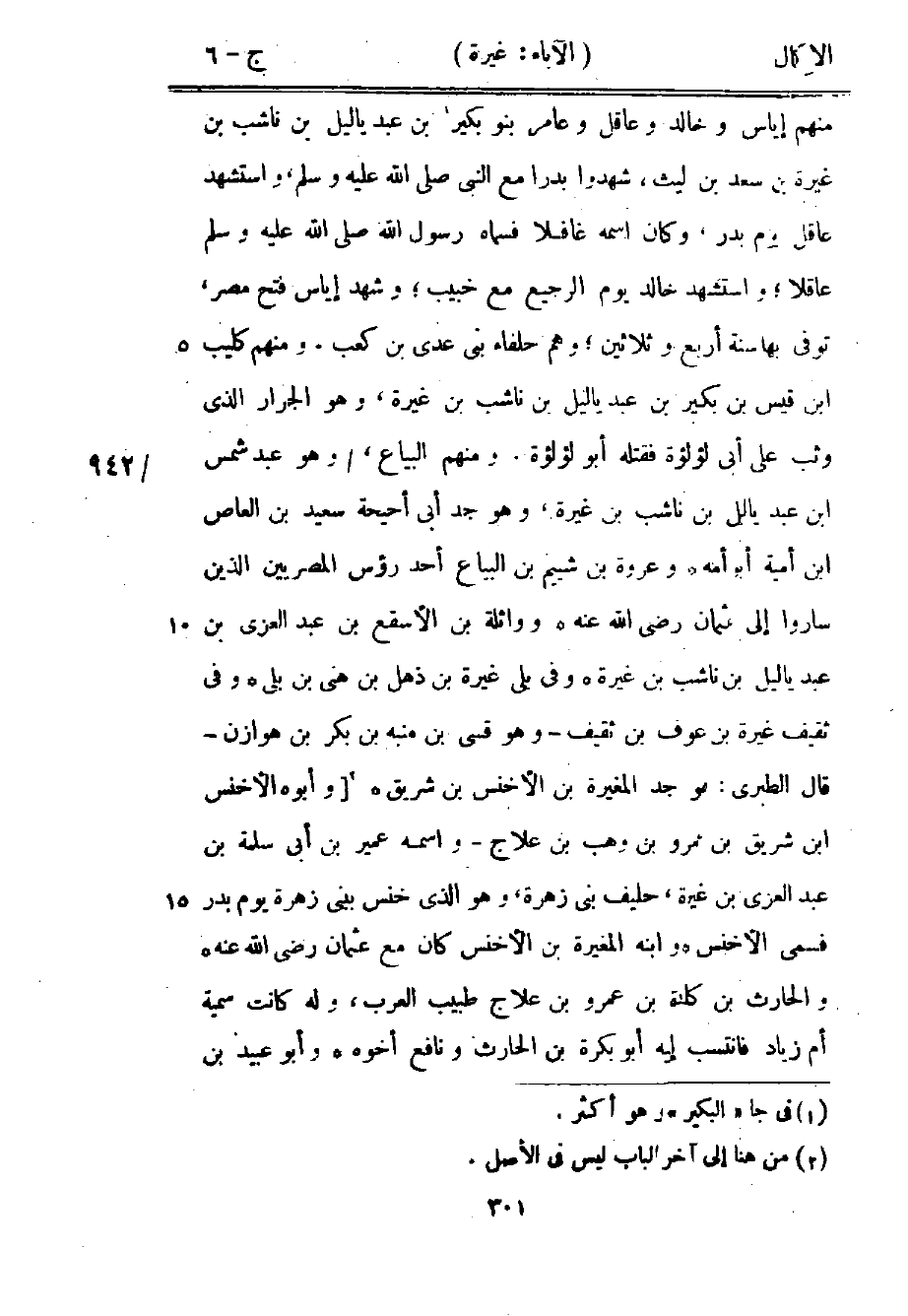 منهم إياس وخالد وعاقل وعامر بنو بكير1 بن عبد ياليل بن ناشب بن غيرة بن سعد بن ليث، شهدوا بدرا مع النبي صلى الله عليه وسلم، واستشهد عاقل يوم بدر، وكان اسمه غافلًا فسماه رسول الله -صلى الله عليه وسلم- عاقلًا؛ واستشهد خالد يوم الرجيع مع خبيب؛ وشهد إياس فتح مصر، توفي بها سنة أربع وثلاثين؛ وهم حلفاء بني عدي بن كعب. ومنهم كليب بن قيس بن بكير بن عبد ياليل بن ناشب بن غيرة، وهو الجرار الذي وثب على أبي لؤلؤة فقتله أبو لؤلؤة. ومنهم البياع، وهو عبد شمس بن عبد ياليل بن ناشب بن غيرة، وهو جد أبي أحيحة سعيد بن العاص بن أمية أبو أمه, وعروة بن شييم بن البياع أحد رءوس المصريين الذين ساروا إلى عثمان رضي الله عنه, وواثلة بن الأسقع بن عبد العزى بن عبد ياليل بن ناشب بن غيرة, وفي بلي غيرة بن ذهل بن هني بن بلي, وفي ثقيف غيرة بن عوف بن ثقيف وهو قسي بن منبه بن بكر بن هوازن, قال الطبري: هو جد المغيرة بن الأخنس بن شريق2 [وأبوه الأخنس بن شريق بن عمرو بن وهب بن علاج, واسمه عمير بن أبي سلمة بن عبد العزى بن غيرة، حليف بني زهرة، وهو الذي خنس ببني زهرة يوم بدر فسمي الأخنس, وابنه المغيرة بن الأخنس كان مع عثمان رضي الله عنه, والحارث بن كلدة بن عمرو بن علاج طبيب العرب، وله كانت سمية أم زياد فانتسب إليه أبو بكرة بن الحارث ونافع أخوه, وأبو عبيد بن