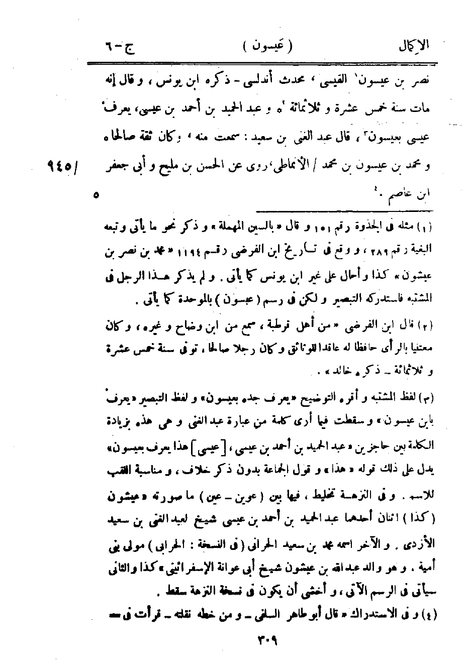 3 لفظ المشتبه وأقره التوضيح "يعرف جده بعيسون" ولفظ التبصير: "يعرف بابن عيسون" وسقطت فيما أرى كلمة من عبارة عبد الغني وهي هذه بزيادة الكلمة بين حاجزين "عبد الحميد بن أحمد بن عيسى [عيسى] هذا يعرف بعيسون" يدل على ذلك قوله "هذا" وقول الجماعة بدون ذكر خلاف، ومناسبة اللقب للاسم. وفي النزهة تخليط، فيما بين "عوين - عين" ما صورته "عيشون "كذا" اثنان: أحدهما عبد الحميد بن أحمد بن عيسى شيخ لعبد الغني بن سعيد الأزدي, والآخر اسمه محمد بن سعيد الحراني "في النسخة: الحرابي" مولى بني أمية، وهو والد عبد الله بن عيشون شيخ أبي عوانة الإسفرائيني" كذا والثاني سيأتي في الرسم الآتي، وأخشى أن يكون في نسخة النزهة سقط.