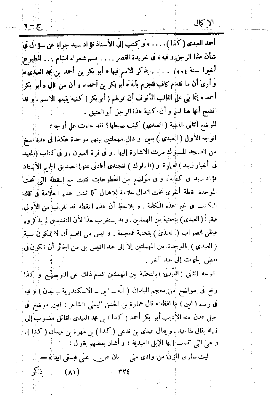 الوجه الثاني "العيدي" بالتحتية بين المهملتين تقدم ذلك عن التوضيح وكذا وقع في مواضع من معجم البلدان "أبَّة, أبين, الإسكندرية, عدن" وفيه في رسم "أبين" ما لفظه "قال عمارة بن الحسن اليمني الشاعر: أبين موضع في جبل عدن منه الأديب أبو بكر أحمد "كذا" بن محمد العيدي القائل, منسوب إلى قبيلة يقال لها عيد، ويقال: عيدي بن ندعى "كذا" بن مهرة بن عيدان "كذا"، وهي التي تنسب إليها الإبل العيدية؛ وأشار بعضهم يقول:
