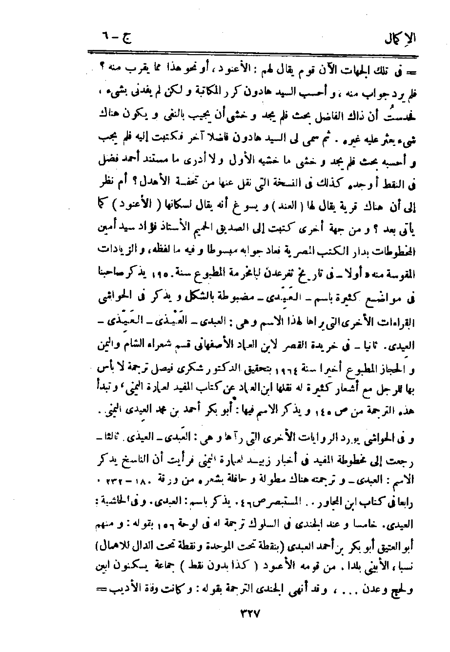 = في تلك الجهات الآن قوم يقال لهم: الأعنود، أو نحو هذا مما يقرب منه؟ فلم يرد جواب منه، وأحسب السيد هادون كرر المكاتبة ولكن لم يفدني بشيء. فحدست أن ذاك الفاضل بحث فلم يجد وخشي أن يجيب بالنفي ويكون هناك شيء يعثر عليه غيره. ثم سمى لي السيد هادون فاضلا آخر فكتبت إليه فلم يجب وأحسبه بحث فلم يجد وخشي ما خشيه الأول ولا أدري ما مستند أحمد فضل في النقط أوجده كذلك في النسخة التي نقل عنها من تحفة الأهدل؟ أم نظر إلى أن هناك قرية يقال لها "العند" ويسوغ أنه يقال لسكانها "الأعنود" كما يأتي بعد؟ ومن جهة أخرى كتبت إلى الصديق الحميم الأستاذ فؤاد سيد أمين المخطوطات بدار الكتب المصرية فعاد جوابه مبسوطا وفيه ما لفظه، والزيادات المقوسة منه "أولا في تاريخ ثغر عدن لبامخرمة المطبوع سنة 1950 يذكر صاحبنا في مواضع كثيرة باسم العيدي مضبوطة بالشكل ويذكر في الحواشي القراءات الأخرى التي يراها لهذا الاسم وهي: العبدي, العَيْذي, العَيّذي, العِيدي. ثانيا في خريدة القصر لابن العماد الأصفهاني قسم شعراء الشام واليمين والحجاز المطبوع أخيرا سنة 1964 بتحقيق الدكتور شكري فيصل ترجمة لا بأس بها للرجل مع أشعار كثيرة له, نقلها ابن العماد عن كتاب المفيد لعمارة اليمني، وتبدأ هذه الترجمة من ص145 ويذكر الاسم فيها: أبو بكر أحمد بن محمد العيدي اليمني.
