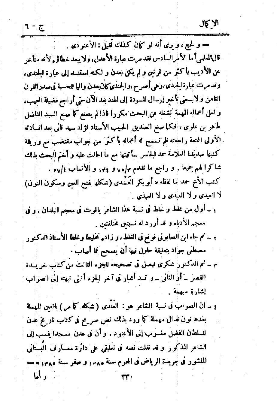 4- أن الصواب في نسبة الشاعر هو: العندي "شكله كما مر" بالعين المهملة بعدها نون فدال مهملة كما ورد بذلك نص صريح في كتاب تاريخ عدن للسلطان الفضل منسوب إلى الأعنود، وأن في عدن مسجدًا ينسب إلى الشاعر المذكور وقد نقلت نصه في تعليقي على دائرة معارف البستاني المنشور في جريدة الرياض في المحرم سنة 1385 وصفر سنة 1385" =