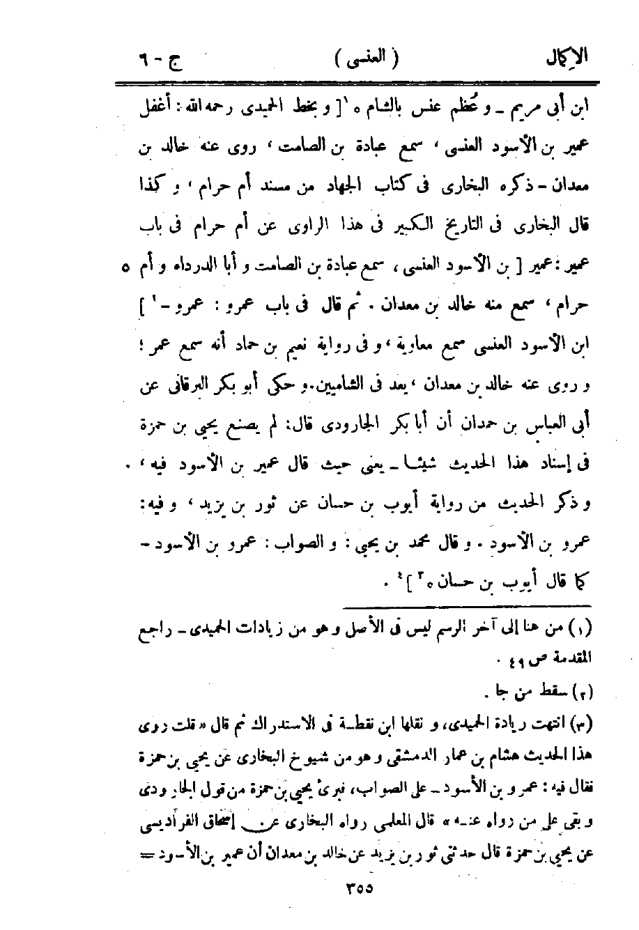 3 انتهت زيادة الحميدي، ونقلها ابن نقطة في الاستدراك ثم قال: "قلت: روى هذا الحديث هشام بن عمار الدمشقي وهو من شيوخ البخاري عن يحيى بن حمزة فقال فيه: عمرو بن الأسود, على الصواب، فبرئ يحيى بن حمزة من قول الجارودي وبقي على من رواه عنه" قال المعلمي: رواه البخاري عن إسحاق الفراديسي عن يحيى بن حمزة قال: حدثني ثور بن يزيد عن خالد بن معدان أن عمير بن الأسود =