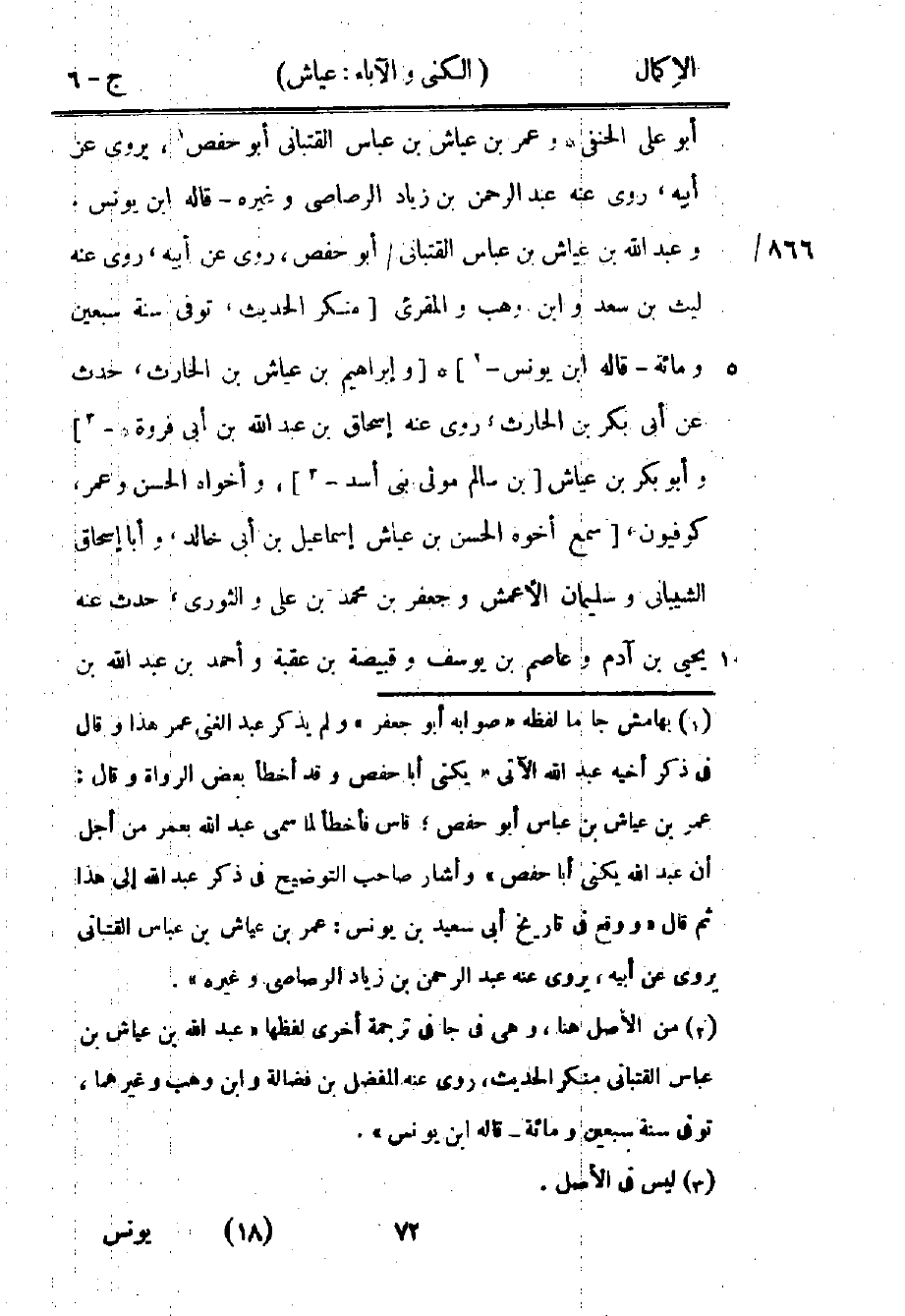 1 بهامش جا ما لفظه "صوابه أبو جعفر" ولم يذكر عبد الغني عمر هذا, وقال في ذكر أخيه عبد الله الآتي: "يكنى أبا حفص وقد أخطأ بعض الرواة وقال: عمر بن عياش بن عباس أبو حفص؛ قاس فأخطأ لما سمى عبد الله بعمر من أجل أن عبد الله يكنى أبا حفص" وأشار صاحب التوضيح في ذكر عبد الله إلى هذا ثم قال: "ووقع في تاريخ أبي سعيد بن يونس: عمر بن عياش بن عباس القتباني يروي عن أبيه، يروي عنه عبد الرحمن بن زياد الرصاصي وغيره".
