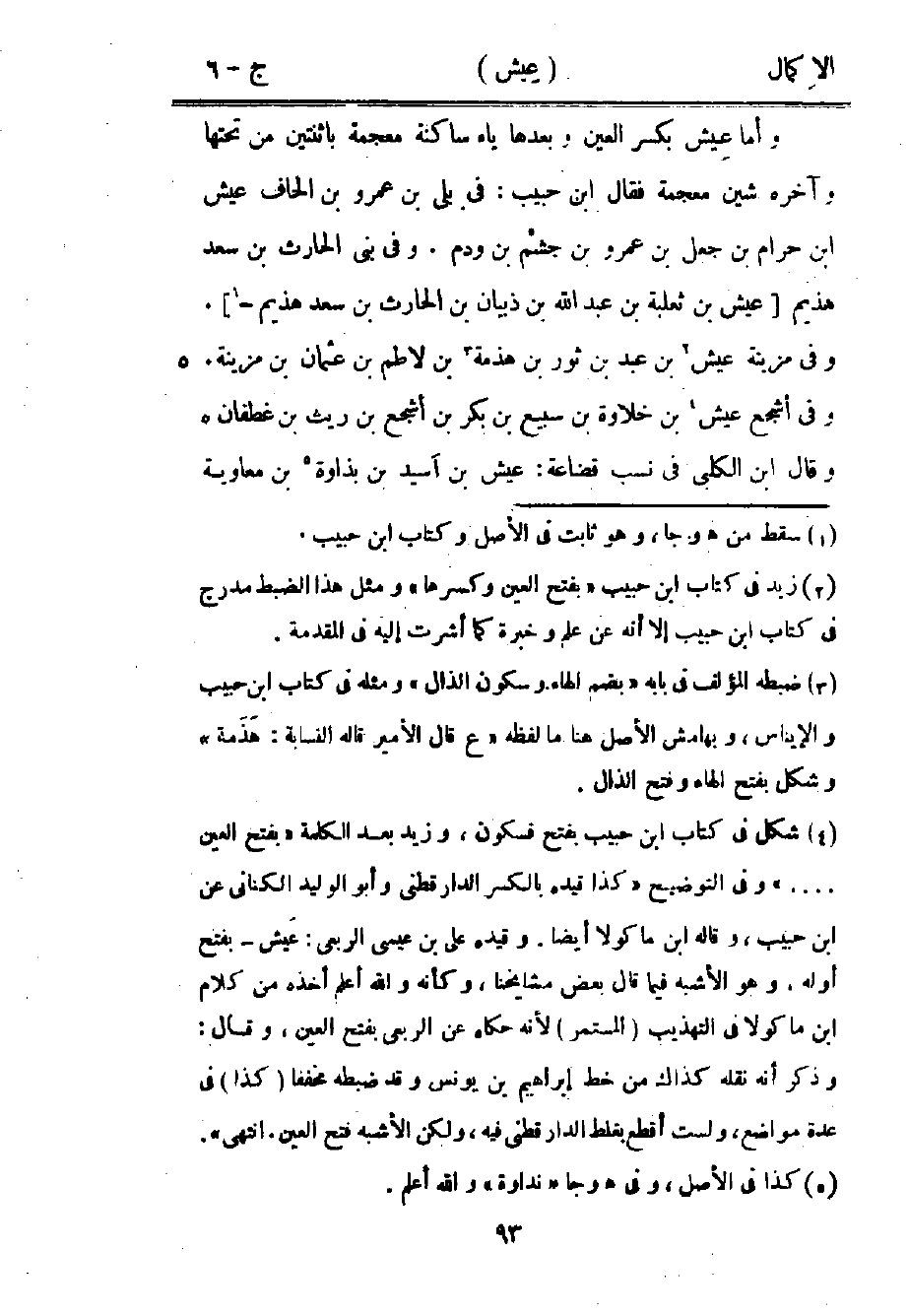 4 شكل في كتاب ابن حبيب بفتح فسكون، وزيد بعد الكلمة "بفتح العين...." وفي التوضيح "كذا قيده بالكسر الدارقطني وأبو الوليد الكناني عن ابن حبيب، وقاله ابن ماكولا أيضًا. وقيده علي بن عيسى الربعي: عيش بفتح أوله, وهو الأشبه فيما قال بعض مشايخنا، وكأنه -والله أعلم- أخذه من كلام ابن ماكولا في التهذيب "المستمر" لأنه حكاه عن الربعي بفتح العين، وقال: وذكر أنه نقله كذاك من خط إبراهيم بن يونس, وقد ضبطه مخففا "كذا" في عدة مواضع، ولست أقطع بغلط الدارقطني فيه، ولكن الأشبه فتح العين. ا. هـ.".