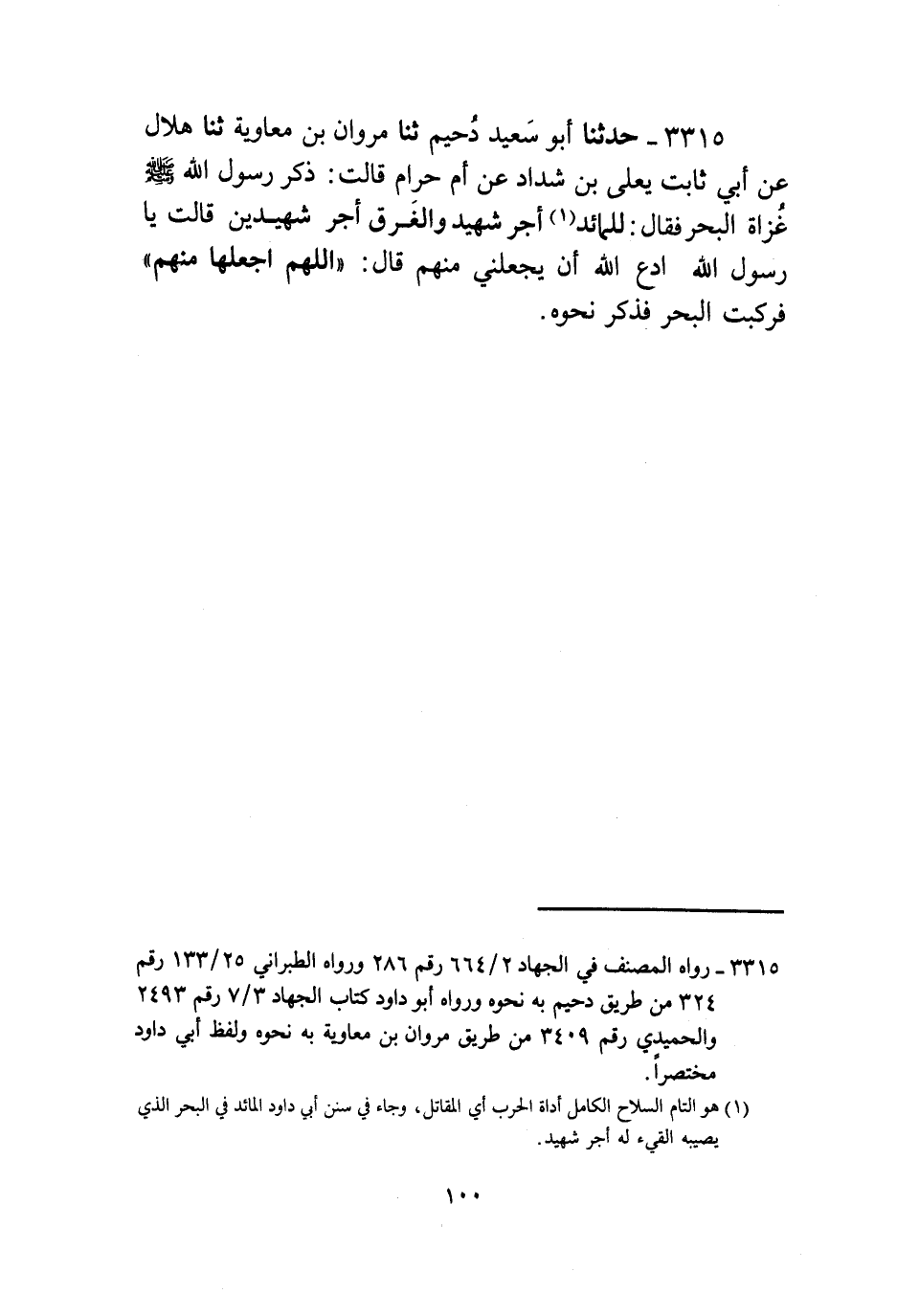 3315 - حَدَّثَنَا أَبُو سَعِيدٍ , دُحَيْمٌ ثنا مَرْوَانُ بْنُ مُعَاوِيَةَ , ثنا هِلَالٌ , عَنْ أَبِي ثَابِتٍ يَعْلَى بْنُ شَدَّادٍ , عَنْ أُمِّ حَرَامٍ , قَالَتْ: ذَكَرَ رَسُولُ اللَّهِ صَلَّى اللهُ عَلَيْهِ وَسَلَّمَ غَزَاةَ الْبَحْرِ فَقَالَ: " §لِلْمَائِدِ أَجْرُ شَهِيدٍ وَالْغَرِقُ أَجْرُ شَهِيدَيْنِ قَالَتْ: يَا رَسُولَ اللَّهِ , ادْعُ اللَّهَ أَنْ يَجْعَلَنِي مِنْهُمْ , قَالَ اللَّهُمَّ اجْعَلْهَا مِنْهُمْ فَرَكِبَتِ الْبَحْرَ فَذَكَرَ نَحْوَهُ.