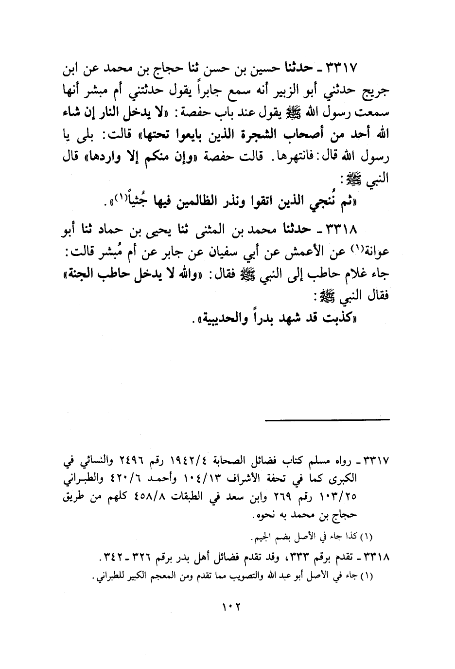 3317 - حَدَّثَنَا حُسَيْنُ بْنُ حَسَنٍ , ثنا حَجَّاجُ بْنُ مُحَمَّدٍ , عَنِ ابْنِ جُرَيْجٍ , حَدَّثَنِي أَبُو الزُّبَيْرِ , أَنَّهُ سَمِعَ جَابِرًا , يَقُولُ: حَدَّثَتْنِي أُمُّ مُبَشِّرٍ , أَنَّهَا سَمِعَتْ رَسُولَ اللَّهِ صَلَّى اللهُ عَلَيْهِ وَسَلَّمَ يَقُولُ عِنْدَ بَابِ حَفْصَةَ: " §لَا يَدْخُلُ النَّارَ إِنْ شَاءَ اللَّهُ أَحَدٌ مِنْ أَصْحَابِ الشَّجَرَةِ الَّذِينَ بَايَعُوا تَحْتَهَا قَالَتْ: بَلَى يَا رَسُولَ اللَّهِ , قَالَ: فَانْتَهَرَهَا قَالَتْ حَفْصَةُ {وَإِنْ مِنْكُمْ إِلَّا وَارِدُهَا} [مريم: 71] قَالَ النَّبِيُّ صَلَّى اللهُ عَلَيْهِ وَسَلَّمَ {ثُمَّ نُنَجِّي الَّذِينَ اتَّقَوْا وَنَذَرُ الظَّالِمِينَ فِيهَا جِثِيًّا} [مريم: 72]