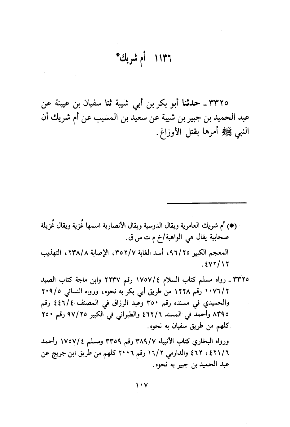 3325 - حَدَّثَنَا أَبُو بَكْرِ بْنُ أَبِي شَيْبَةَ , ثنا سُفْيَانُ بْنُ عُيَيْنَةَ , عَنْ عَبْدِ الْحَمِيدِ بْنِ جُبَيْرِ بْنِ شَيْبَةَ , عَنْ سَعِيدِ بْنِ الْمُسَيِّبِ , عَنْ أُمِّ شَرِيكٍ , أَنَّ النَّبِيَّ صَلَّى اللهُ عَلَيْهِ وَسَلَّمَ §أَمَرَهَا بِقَتْلِ الْأَوْزَاغِ.