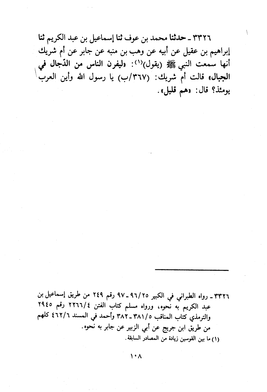 3326 - حَدَّثَنَا مُحَمَّدُ بْنُ عَوْفٍ , ثنا إِسْمَاعِيلُ بْنُ عَبْدِ الْكَرِيمِ , ثنا إِبْرَاهِيمُ بْنُ عُقَيْلٍ , عَنْ أَبِيهِ , عَنْ وَهْبِ بْنِ مُنَبِّهٍ , عَنْ جَابِرٍ , عَنْ أُمِّ شَرِيكٍ , أَنَّهَا سَمِعَتِ النَّبِيَّ صَلَّى اللهُ عَلَيْهِ وَسَلَّمَ يَقُولُ: §لَيَفِرَّنَّ النَّاسُ مِنَ الدَّجَّالِ فِي الْجِبَالِ , قَالَتْ أُمُّ شَرِيكٍ: يَا رَسُولَ اللَّهِ , وَأَيْنَ الْعَرَبُ يَوْمَئِذٍ؟ قَالَ: هُمْ قَلِيلٌ.