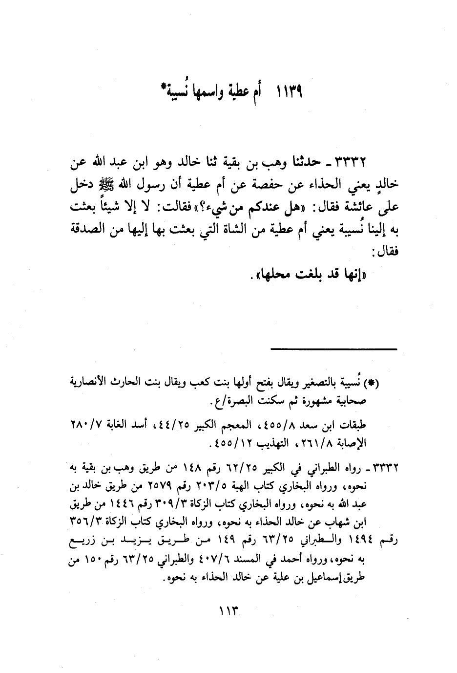 3332 - حَدَّثَنَا وَهْبُ بْنُ بَقِيَّةَ , ثنا خَالِدٌ , وَهُوَ ابْنُ عَبْدِ اللَّهِ عَنْ خَالِدٍ يَعْنِي الْحَذَّاءَ , عَنْ حَفْصَةَ , عَنْ أُمِّ عَطِيَّةَ , أَنَّ رَسُولَ اللَّهِ صَلَّى اللهُ عَلَيْهِ وَسَلَّمَ دَخَلَ عَلَى عَائِشَةَ فَقَالَ: هَلْ عِنْدَكُمْ مِنْ شَيْءٍ؟ فَقَالَتْ: لَا إِلَّا شَيْئًا بَعَثَتْ بِهِ إِلَيْنَا نُسَيْبَةُ يَعْنِي أُمَّ عَطِيَّةَ مِنَ الشَّاةِ الَّتِي بَعَثَتْ بِهَا إِلَيْهَا مِنَ الصَّدَقَةِ فَقَالَ: §إِنَّهَا قَدْ بَلَغَتْ مَحِلَّهَا