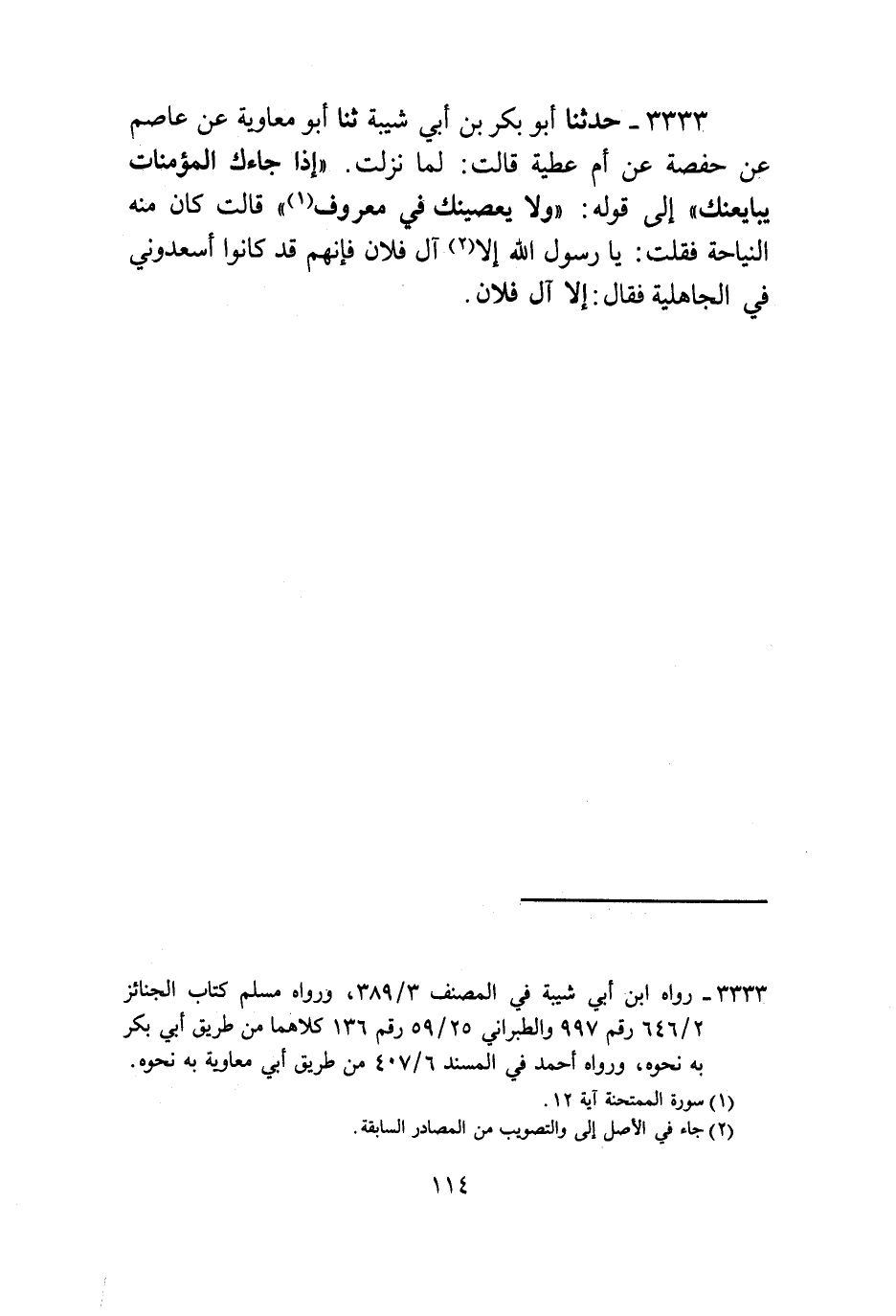 3333 - حَدَّثَنَا أَبُو بَكْرِ بْنُ أَبِي شَيْبَةَ , ثنا أَبُو مُعَاوِيَةَ , عَنْ عَاصِمٍ , عَنْ حَفْصَةَ , عَنْ أُمِّ عَطِيَّةَ , قَالَتْ: لَمَّا نَزَلَتْ {§إِذَا جَاءَكَ الْمُؤْمِنَاتُ يُبَايِعْنَكَ} [الممتحنة: 12] إِلَى قَوْلِهِ {وَلَا يَعْصِينَكَ فِي مَعْرُوفٍ} [الممتحنة: 12] قَالَتْ: كَانَ مِنْهُ النِّيَاحَةُ فَقُلْتُ: يَا رَسُولَ اللَّهِ , إِلَّا آلَ فُلَانٍ فَإِنَّهُمْ قَدْ كَانُوا أَسْعَدُونِي فِي الْجَاهِلِيَّةِ , فَقَالَ إِلَّا آلَ فُلَانٍ.