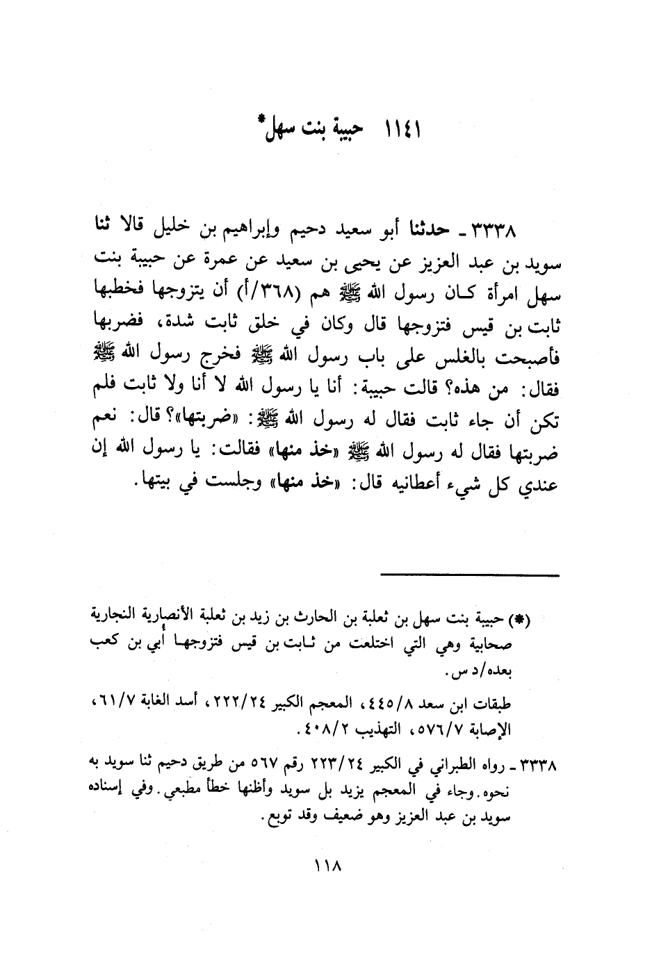 3338 - حَدَّثَنَا أَبُو سَعِيدٍ , دُحَيْمٌ وَإِبْرَاهِيمُ بْنُ خَلِيلٍ قَالَا: ثنا سُوَيْدُ بْنُ عَبْدِ الْعَزِيزِ , عَنْ يَحْيَى بْنِ سَعِيدٍ , عَنْ عَمْرَةَ , عَنْ حَبِيبَةَ بِنْتِ سَهْلٍ , امْرَأَةٍ كَانَ رَسُولُ اللَّهِ صَلَّى اللهُ عَلَيْهِ وَسَلَّمَ هَمَّ أَنْ يَتَزَوَّجُهَا فَخَطَبَهَا ثَابِتُ بْنُ قَيْسٍ فَتَزَوَّجَهَا قَالَ: وَكَانَ فِي خُلُقِ ثَابِتٍ شِدَّةٌ فَضَرَبَهَا فَأَصْبَحَتْ بِالْغَلَسِ عَلَى بَابِ رَسُولِ اللَّهِ صَلَّى اللهُ عَلَيْهِ وَسَلَّمَ فَخَرَجَ رَسُولُ اللَّهِ صَلَّى اللهُ عَلَيْهِ وَسَلَّمَ فَقَالَ: مَنْ هَذِهِ؟ قَالَتْ: حَبِيبَةُ أَنَا يَا رَسُولَ اللَّهِ , لَا أَنَا وَلَا ثَابِتٌ فَلَمْ تَكُنْ أَنْ جَاءَ ثَابِتٌ فَقَالَ لَهُ رَسُولُ اللَّهِ صَلَّى اللهُ عَلَيْهِ وَسَلَّمَ: §ضَرَبْتَهَا؟ قَالَ: نَعَمْ ضَرَبْتُهَا فَقَالَ لَهُ رَسُولُ اللَّهِ صَلَّى اللهُ عَلَيْهِ وَسَلَّمَ: خُذْ مِنْهَا فَقَالَتْ يَا رَسُولَ اللَّهِ , إِنَّ عِنْدِي كُلَّ شَيْءٍ أَعْطَانِيهِ قَالَ: خُذْ مِنْهَا وَجَلَسَتْ فِي بَيْتِهَا -[119]-.