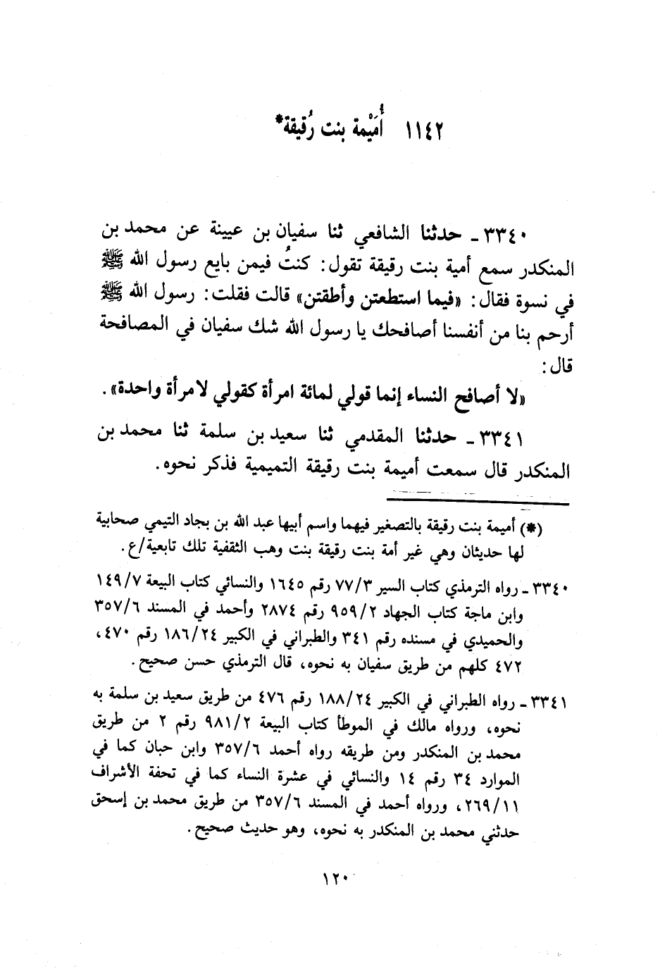 3340 - حَدَّثَنَا الشَّافِعِيُّ , ثنا سُفْيَانُ بْنُ عُيَيْنَةَ , عَنْ مُحَمَّدِ بْنِ الْمُنْكَدِرِ , سَمِعَ أُمَيْمَةَ بِنْتَ رُقَيْقَةَ , تَقُولُ: كُنْتُ فِيمَنْ بَايَعَ رَسُولَ اللَّهِ صَلَّى اللهُ عَلَيْهِ وَسَلَّمَ فِي نِسْوَةٍ فَقَالَ: فِيمَا اسْتَطَعْتُنَّ وَأَطَقْتُنَّ قَالَتْ: فَقُلْتُ: رَسُولُ اللَّهِ صَلَّى اللهُ عَلَيْهِ وَسَلَّمَ أَرْحَمُ بِنَا مِنْ أَنْفُسِنَا أُصَافِحُكَ يَا رَسُولَ اللَّهِ , - شَكَّ سُفْيَانُ فِي الْمُصَافَحَةِ - قَالَ: §لَا أُصَافِحُ النِّسَاءَ إِنَّمَا قَوْلِي لَمِائَةِ امْرَأَةٍ كَقَوْلِي لِامْرَأَةٍ وَاحِدَةٍ.
