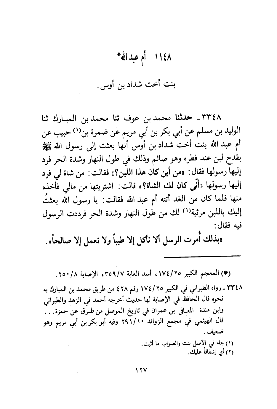 3348 - حَدَّثَنَا مُحَمَّدُ بْنُ عَوْفٍ , ثنا مُحَمَّدُ بْنُ الْمُبَارَكِ , ثنا الْوَلِيدُ بْنُ مُسْلِمٍ , عَنْ أَبِي بَكْرِ بْنِ أَبِي مَرْيَمَ , عَنْ ضَمْرَةَ بْنِ حَبِيبٍ , عَنْ أُمِّ عَبْدِ اللَّهِ بِنْتِ أُخْتِ , شَدَّادِ بْنِ أَوْسٍ أَنَّهَا بَعَثَتْ إِلَى رَسُولِ اللَّهِ صَلَّى اللهُ عَلَيْهِ وَسَلَّمَ بِقَدَحِ لَبَنٍ عِنْدَ فِطْرِهِ وَهُوَ صَائِمٌ وَذَلِكَ فِي طُولِ النَّهَارِ وَشِدَّةِ الْحَرِّ فَرَدَّ إِلَيْهَا رَسُولَهَا فَقَالَ: مِنْ أَيْنَ كَانَ هَذَا اللَّبَنُ؟ فَقَالَتْ: مِنْ شَاةٍ لِي فَرَدَّ إِلَيْهَا رَسُولَهَا أَنَّى كَانَ لَكِ الشَّاةُ؟ قَالَتْ: اشْتَرَيْتُهَا مِنْ مَالِي فَأَخَذَهُ مِنْهَا فَلَمَّا كَانَ مِنَ الْغَدِ أَتَتْهُ أُمُّ عَبْدِ اللَّهِ فَقَالَتْ: يَا رَسُولَ اللَّهِ , بَعَثْتُ إِلَيْكَ بِاللَّبِنِ مُرْثِيَةً لَكَ مِنْ طُولِ النَّهَارِ وَشِدَّةِ الْحَرِّ فَرَدَدْتَ الرَّسُولَ فِيهِ , فَقَالَ: بِذَلِكَ أُمِرَتِ الرُّسُلُ §أَلَّا نَأْكُلَ إِلَّا طَيِّبًا وَلَا نَعْمَلَ إِلَّا صَالِحًا