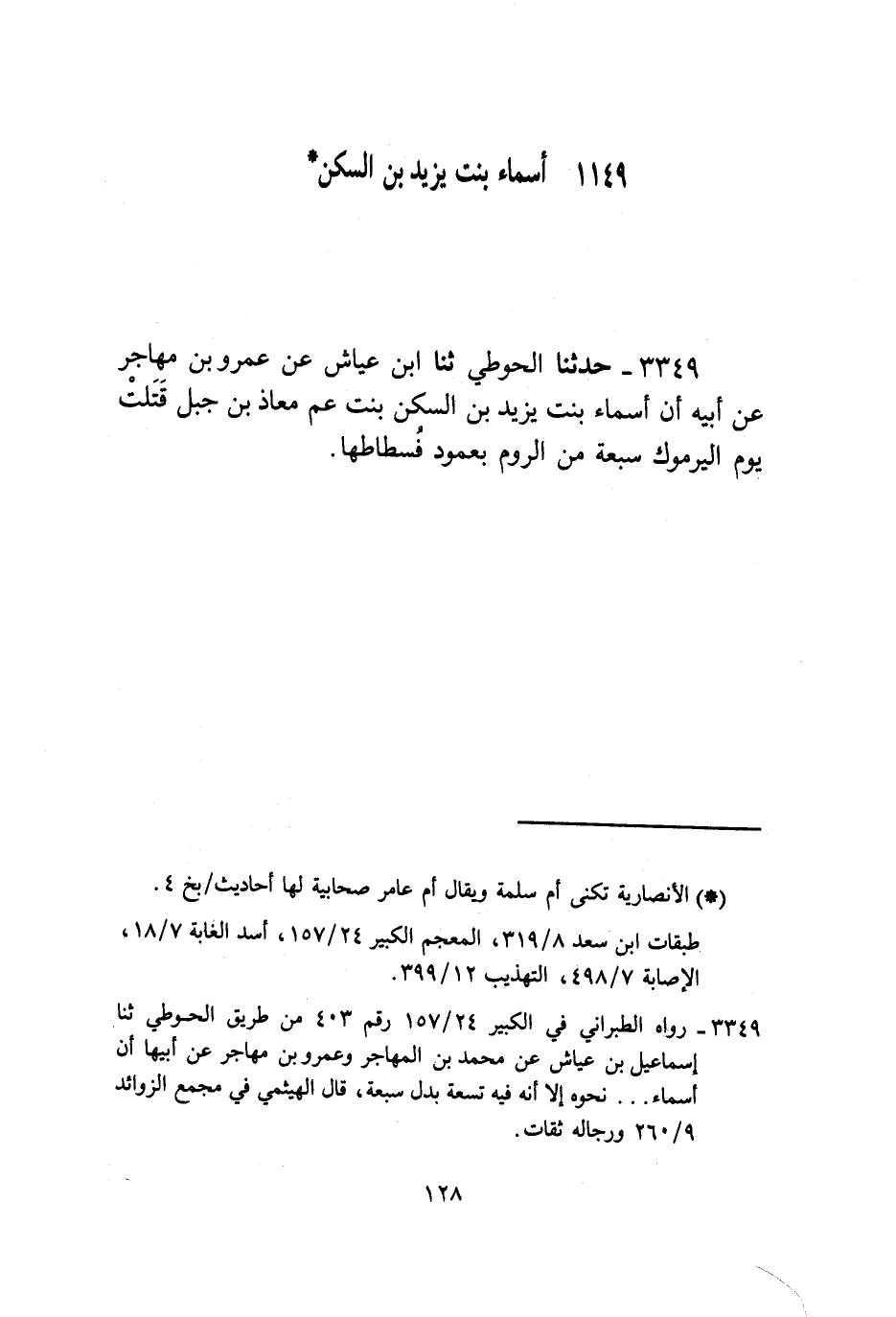 3349 - حَدَّثَنَا الْحَوْطِيُّ , ثَنا ابْنُ عَيَّاشٍ , عَنْ عَمْرِو بْنِ مُهَاجِرٍ , عَنْ أَبِيهِ , أَنَّ أَسْمَاءَ بِنْتَ يَزِيدَ بْنِ السَّكَنِ بِنْتَ عَمِّ مُعَاذِ بْنِ جَبَلٍ §قَتَلَتْ يَوْمَ الْيَرْمُوكِ سَبْعَةً مِنَ الرُّومِ بِعَمُودِ فُسْطَاطِهَا. وَمِمَّا أَسَنَدَتْ