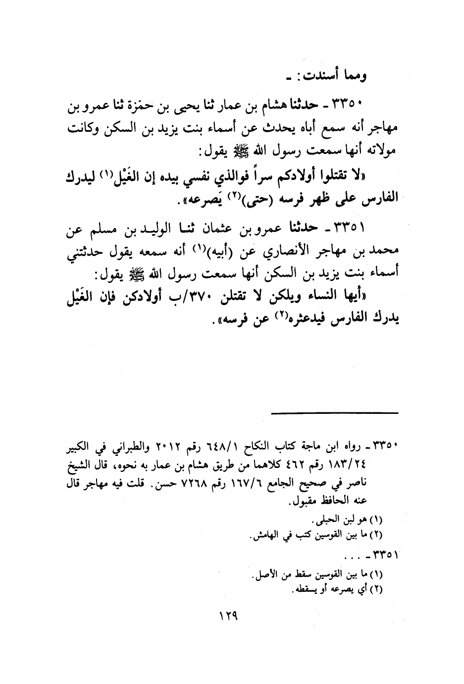 3350 - حَدَّثَنَا هِشَامُ بْنُ عَمَّارٍ , ثنا يَحْيَى بْنُ حَمْزَةَ , ثنا عَمْرُو بْنُ مُهَاجِرٍ , أَنَّهُ سَمِعَ أَبَاهُ , يُحَدِّثُ عَنْ أَسْمَاءَ بِنْتِ يَزِيدَ بْنِ السَّكَنِ , وَكَانَتْ , مَوْلَاتَهُ أَنَّهَا سَمِعَتْ رَسُولَ اللَّهِ صَلَّى اللهُ عَلَيْهِ وَسَلَّمَ يَقُولُ: «§لَا تَقْتُلُوا أَوْلَادَكُمْ سِرًّا فَوَالَّذِي نَفْسِي بِيَدِهِ إِنَّ الْغَيْلَ لَيُدْرِكُ الْفَارِسَ عَلَى ظَهْرِ فَرَسِهِ حَتَّى يَصْرَعَهُ»