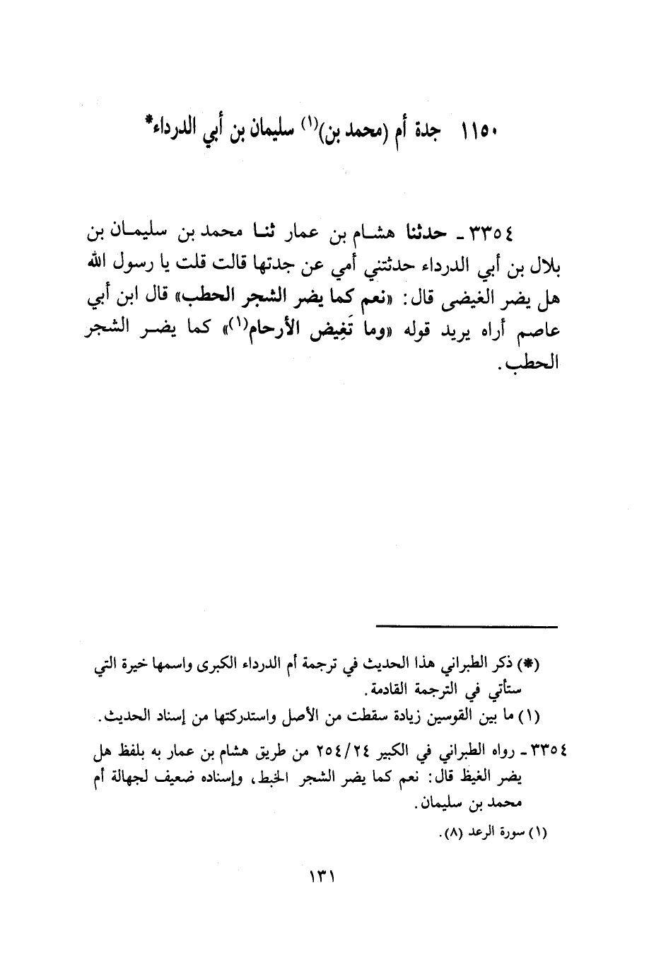 3354 - حَدَّثَنَا هِشَامُ بْنُ عَمَّارٍ , ثنا مُحَمَّدُ بْنُ سُلَيْمَانَ بْنِ بِلَالِ بْنِ أَبِي الدَّرْدَاءِ , حَدَّثَتْنِي أُمِّي , عَنْ جَدَّتِهَا , قَالَتْ: قُلْتُ: يَا رَسُولَ اللَّهِ , §هَلْ يَضُرُّ الْغَيْضُ؟ قَالَ: نَعَمْ كَمَا يَضُرُّ الشَّجَرُ الْحَطَبَ. قَالَ ابْنُ أَبِي عَاصِمٍ: أُرَاهُ يُرِيدُ قَوْلَهُ {وَمَا تَغِيضُ الْأَرْحَامُ} [الرعد: 8] كَمَا يَضُرُّ الشَّجَرُ الْحَطَبَ.