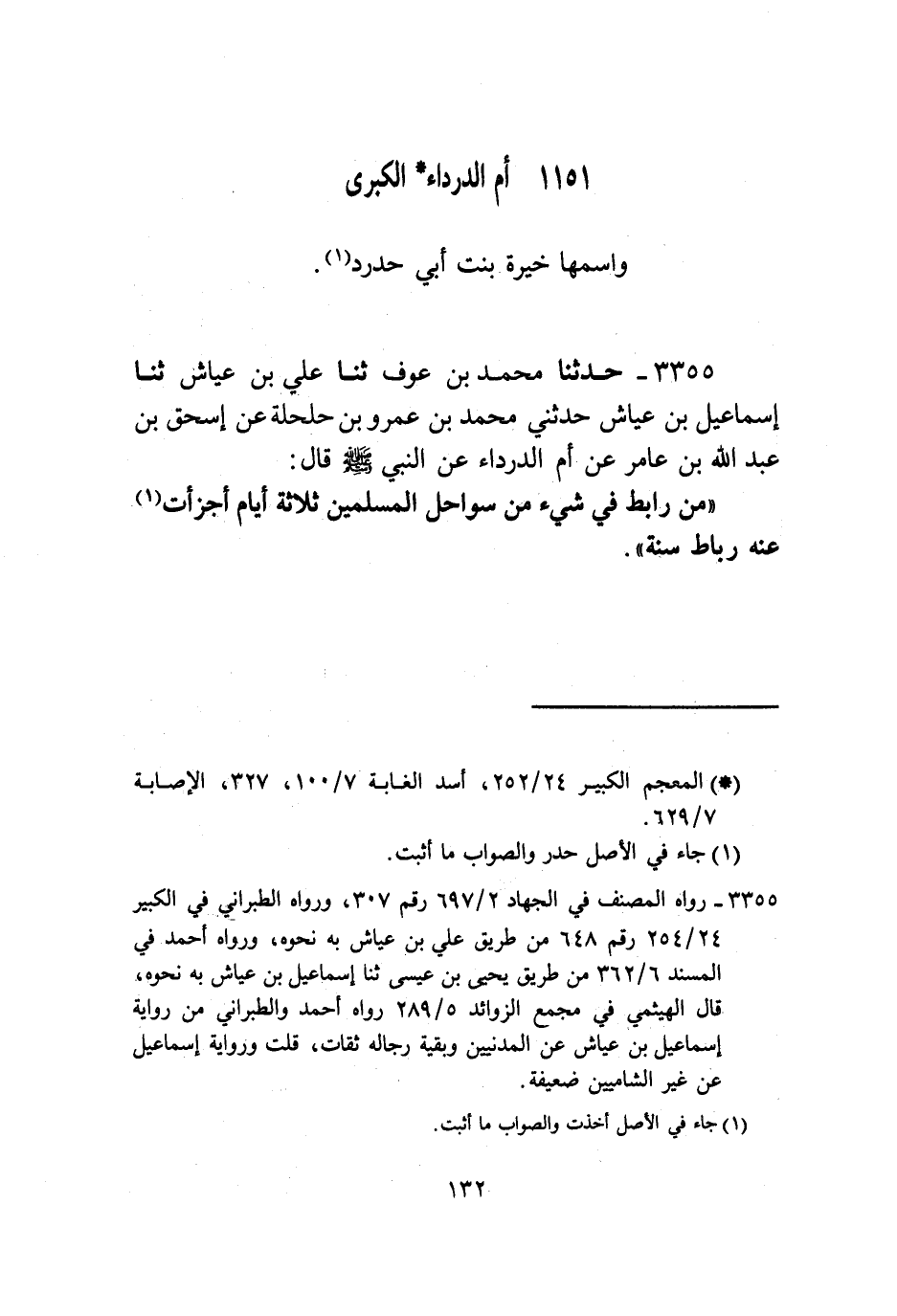 3355 - حَدَّثَنَا مُحَمَّدُ بْنُ عَوْفٍ , ثنا عَلِيُّ بْنُ عَيَّاشٍ , ثنا إِسْمَاعِيلُ بْنُ عَيَّاشٍ , حَدَّثَنِي مُحَمَّدُ بْنُ عَمْرِو بْنِ حَلْحَلَةَ , عَنْ إِسْحَاقَ بْنِ عَبْدِ اللَّهِ بْنِ عَامِرٍ , عَنْ أُمِّ الدَّرْدَاءٍ , عَنِ النَّبِيِّ صَلَّى اللهُ عَلَيْهِ وَسَلَّمَ قَالَ: «§مَنْ رَابَطَ فِي شَيْءٍ مِنْ سَوَاحِلِ الْمُسْلِمِينَ ثَلَاثَةَ أَيَّامٍ أَجْزَأَتْ عَنْهُ رِبَاطَ سَنَةٍ»
