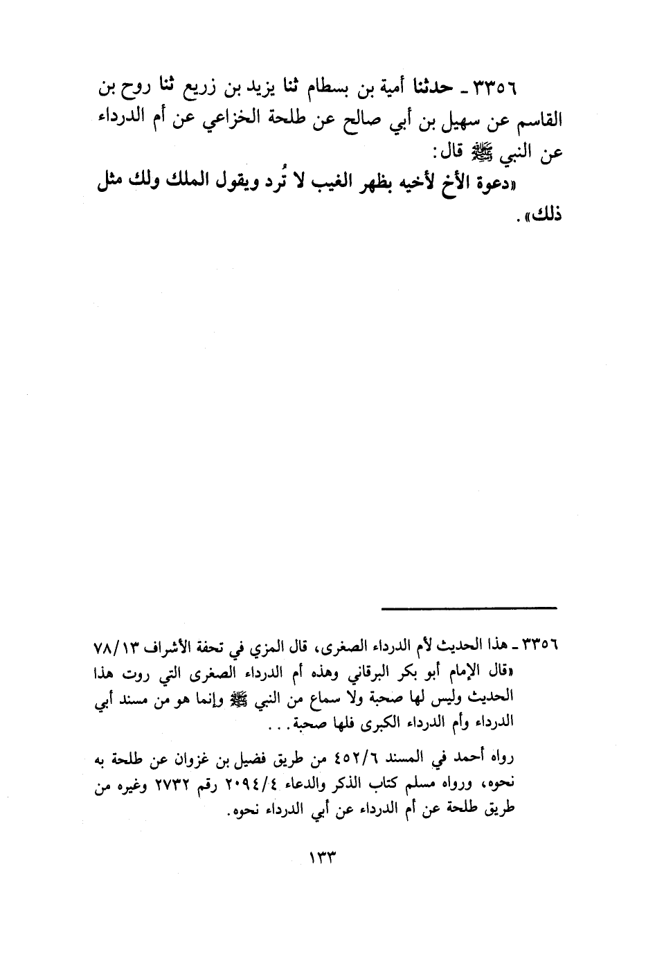 3356 - حَدَّثَنَا أُمَيَّةُ بْنُ بِسْطَامٍ , ثَنا يَزِيدُ بْنُ زُرَيْعٍ , ثنا رَوْحُ بْنُ الْقَاسِمِ , عَنْ سُهَيْلِ بْنِ أَبِي صَالِحٍ , عَنْ طَلْحَةَ الْخُزَاعِيِّ , عَنْ أُمِّ الدَّرْدَاءِ , عَنِ النَّبِيِّ صَلَّى اللهُ عَلَيْهِ وَسَلَّمَ قَالَ: «§دَعْوَةُ الْأَخِ لِأَخِيهِ بِظَهْرِ الْغَيْبِ لَا تُرَدُّ وَيَقُولُ الْمَلَكُ وَلَكَ مِثْلُ ذَلِكَ»