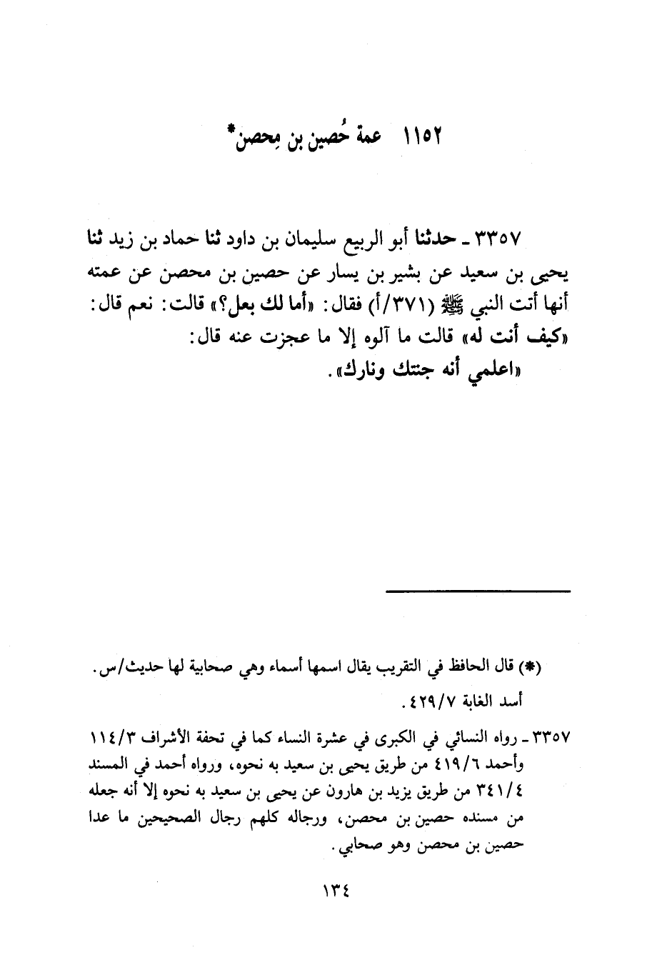 3357 - حَدَّثَنَا أَبُو الرَّبِيعِ سُلَيْمَانُ بْنُ دَاودَ ثنا حَمَّادُ بْنُ زَيْدٍ , ثنا يَحْيَى بْنُ سَعِيدٍ , عَنْ بَشِيرِ بْنِ يَسَارٍ , عَنْ حُصَيْنِ بْنِ مِحْصَنٍ , عَنْ عَمَّتِهِ , أَنَّهَا أَتَتِ النَّبِيَّ صَلَّى اللهُ عَلَيْهِ وَسَلَّمَ فَقَالَ: أَمَا لَكِ بَعْلٌ؟ قَالَتْ: نَعَمْ قَالَ: كَيْفَ أَنْتِ لَهُ؟ قَالَتْ: مَا آلُوهُ إِلَّا مَا عَجَزْتُ عَنْهُ , قَالَ: §اعْلَمِي أَنَّهُ جَنَّتُكِ وَنَارُكِ.
