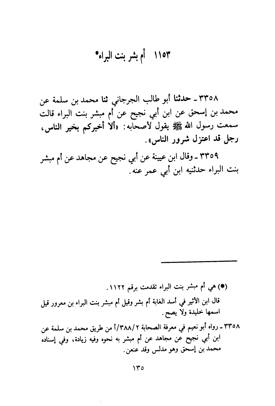 3358 - حَدَّثَنَا أَبُو طَالِبٍ الْجُرْجَانِيُّ , ثنا مُحَمَّدُ بْنُ سَلَمَةَ , عَنْ مُحَمَّدِ بْنِ إِسْحَاقَ , عَنِ ابْنِ أَبِي نَجِيحٍ , عَنْ أُمِّ مُبَشِّرٍ بِنْتِ الْبَرَاءِ , قَالَتْ: سَمِعْتُ رَسُولَ اللَّهِ صَلَّى اللهُ عَلَيْهِ وَسَلَّمَ يَقُولُ لِأَصْحَابِهِ: «§أَلَا أُخْبِرُكُمْ بِخَيْرِ النَّاسِ؟ رَجُلٌ قَدِ اعْتَزَلَ شُرُورَ النَّاسِ»
