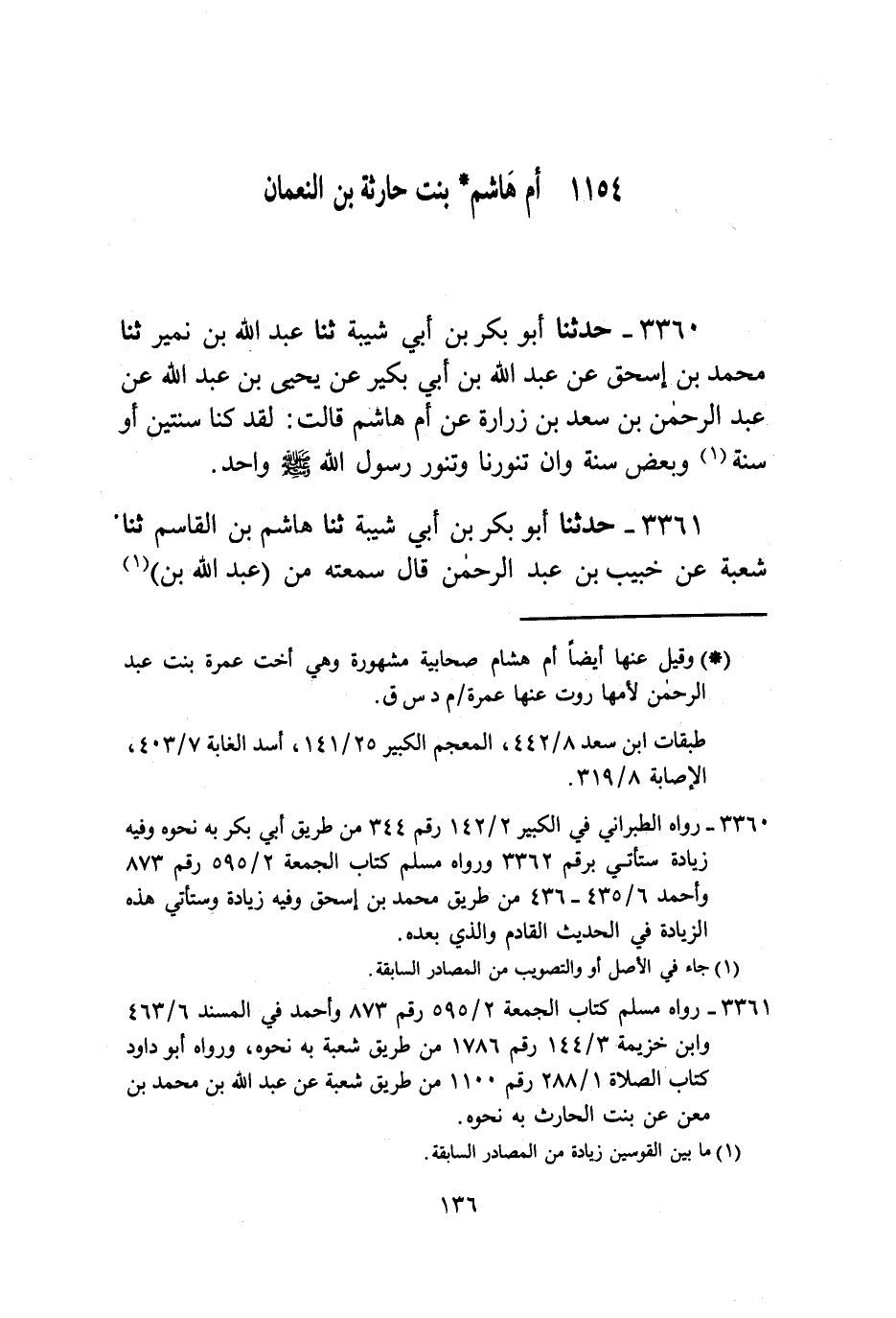 3360 - حَدَّثَنَا أَبُو بَكْرِ بْنُ أَبِي شَيْبَةَ , ثنا عَبْدُ اللَّهِ بْنُ نُمَيْرٍ , ثنا مُحَمَّدُ بْنُ إِسْحَاقَ , عَنْ عَبْدِ اللَّهِ بْنِ أَبِي بُكَيْرٍ , عَنْ يَحْيَى بْنِ عَبْدِ اللَّهِ , عَنْ عَبْدِ الرَّحْمَنِ بْنِ سَعْدِ بْنِ زُرَارَةَ , عَنْ أُمِّ هَاشِمٍ , قَالَتْ: لَقَدْ كُنَّا سَنَتَيْنِ أَوْ سَنَةً وَبَعْضَ سَنَةٍ §وَإِنَّ تَنُّورَنَا وَتَنُّورَ رَسُولِ اللَّهِ صَلَّى اللهُ عَلَيْهِ وَسَلَّمَ وَاحِدٌ.