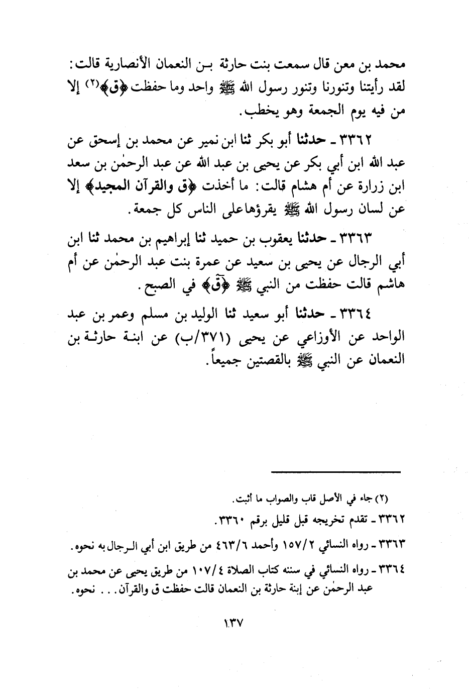 3362 - حَدَّثَنَا أَبُو بَكْرٍ , ثَنا ابْنُ نُمَيْرٍ , عَنْ مُحَمَّدِ بْنِ إِسْحَاقَ , عَنْ عَبْدِ اللَّهِ بْنِ أَبِي بَكْرٍ , عَنْ يَحْيَى بْنِ عَبْدِ اللَّهِ , عَنْ عَبْدِ الرَّحْمَنِ بْنِ سَعْدِ بْنِ زُرَارَةَ , عَنْ أُمِّ هِشَامٍ , قَالَتْ: §مَا أَخَذْتُ ق وَالْقُرْآنِ الْمَجِيدِ إِلَّا عَنْ لِسَانِ رَسُولِ اللَّهِ صَلَّى اللهُ عَلَيْهِ وَسَلَّمَ يَقْرَؤُهَا عَلَى النَّاسِ كُلَّ جُمُعَةٍ.