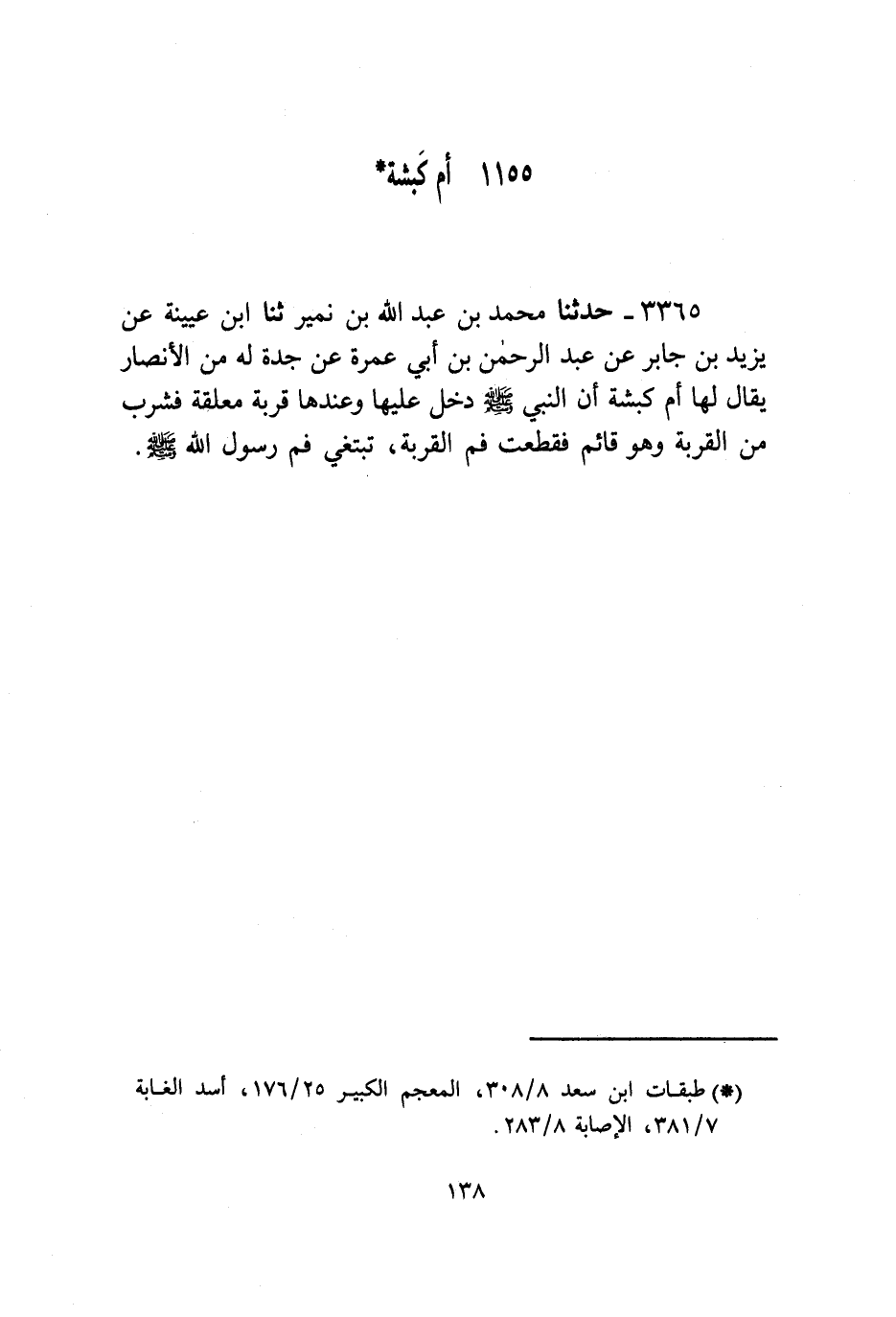 3365 - حَدَّثَنَا مُحَمَّدُ بْنُ عَبْدِ اللَّهِ بْنِ نُمَيْرٍ , ثَنا ابْنُ عُيَيْنَةَ , عَنْ يَزِيدَ بْنِ جَابِرٍ , عَنْ عَبْدِ الرَّحْمَنِ بْنِ أَبِي عَمْرَةَ , عَنْ جَدَّةٍ , لَهُ مِنَ الْأَنْصَارِ يُقَالُ لَهَا: أُمُّ كَبْشَةَ أَنَّ النَّبِيَّ صَلَّى اللهُ عَلَيْهِ وَسَلَّمَ §دَخَلَ عَلَيْهَا وَعِنْدَهَا قِرْبَةٌ مُعَلَّقَةٌ فَشَرِبَ مِنَ الْقِرْبَةِ وَهُوَ قَائِمٌ فَقَطَعَتْ فَمَ الْقِرْبَةِ تَبْتَغِي فَمَ رَسُولِ اللَّهِ صَلَّى اللهُ عَلَيْهِ وَسَلَّمَ.