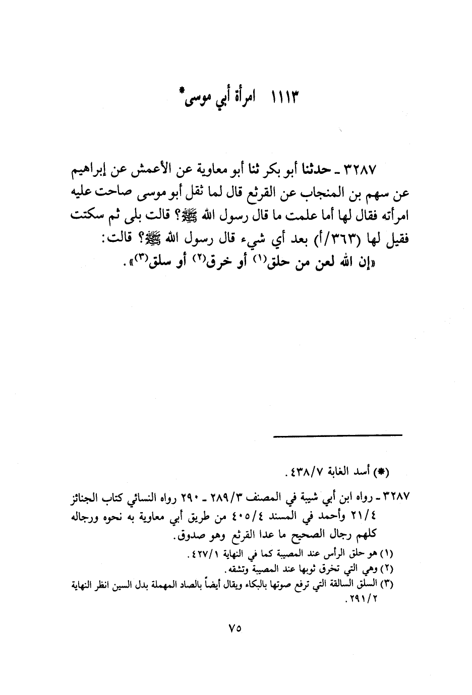 3287 - حَدَّثَنَا أَبُو بَكْرٍ , ثنا أَبُو مُعَاوِيَةَ , عَنِ الْأَعْمَشِ , عَنْ إِبْرَاهِيمَ , عَنْ سَهْمِ بْنِ الْمِنْجَابِ , عَنِ الْقَرْثَعِ , قَالَ: لَمَّا ثَقُلَ أَبُو مُوسَى صَاحَتْ عَلَيْهِ امْرَأَتُهُ فَقَالَ لَهَا: أَمَا عَلِمْتِ مَا قَالَ رَسُولُ اللَّهِ صَلَّى اللهُ عَلَيْهِ وَسَلَّمَ؟ قَالَتْ: بَلَى ثُمَّ سَكَتَتْ فَقِيلَ لَهَا بَعْدُ: أَيُّ شَيْءٍ قَالَ رَسُولُ اللَّهِ صَلَّى اللهُ عَلَيْهِ وَسَلَّمَ؟ قَالَتْ: §إِنَّ اللَّهَ لَعَنَ مَنْ حَلَقَ أَوْ خَرَقَ أَوْ سَلَقَ.