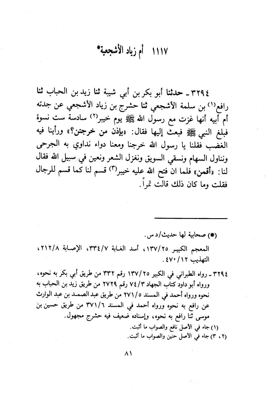 3294 - حَدَّثَنَا أَبُو بَكْرِ بْنُ أَبِي شَيْبَةَ , ثنا زَيْدُ بْنُ الْحُبَابِ , ثنا رَافِعُ بْنُ سَلَمَةَ الْأَشْجَعِيُّ , ثنا حَشْرَجُ بْنُ زِيَادٍ الْأَشْجَعِيُّ , عَنْ جَدَّتِهِ أُمِّ أَبِيهِ , أَنَّهَا غَزَتْ مَعَ رَسُولِ اللَّهِ صَلَّى اللهُ عَلَيْهِ وَسَلَّمَ يَوْمَ خَيْبَرَ سَادِسَةَ سِتِّ نِسْوَةٍ فَبَلَغَ النَّبِيَّ صَلَّى اللهُ عَلَيْهِ وَسَلَّمَ فَبَعَثَ إِلَيْهَا فَقَالَ: " §بِإِذْنِ مَنْ خَرَجْتُنَّ وَرَأَيْنَا فِيهِ الْغَضَبَ فَقُلْنَا: يَا رَسُولَ اللَّهِ , خَرَجْنَا وَمَعَنَا دَوَاءٌ نُدَاوِي بِهِ الْجَرْحَى وَنُنَاوِلُ السِّهَامَ وَنَسْقِي السَّوِيقَ وَنَغْزِلُ الشَّعَرَ وَنُعِينُ فِي سَبِيلِ اللَّهِ فَقَالَ لَنَا: أَقِمْنَ فَلَمَّا أَنْ فَتَحَ اللَّهُ عَلَيْهِ خَيْبَرَ قَسَمَ لَنَا كَمَا قَسَمَ لِلرِّجَالِ فَقُلْتُ: وَمَا كَانَ ذَلِكَ؟ قَالَتْ: تَمْرًا.