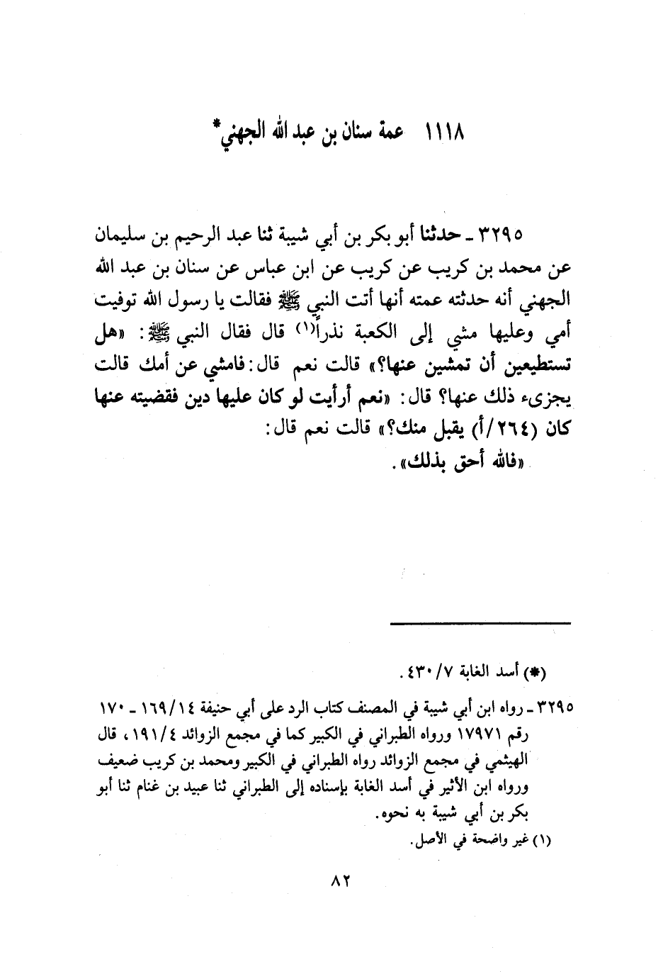 3295 - حَدَّثَنَا أَبُو بَكْرِ بْنُ أَبِي شَيْبَةَ , ثنا عَبْدِ الرَّحِيمِ بْنُ سُلَيْمَانَ , عَنْ مُحَمَّدِ بْنِ كُرَيْبٍ , عَنْ كُرَيْبٍ , عَنِ ابْنِ عَبَّاسٍ , عَنْ سِنَانِ بْنِ عَبْدِ اللَّهِ الْجُهَنِيِّ , أَنَّهُ حَدَّثَتْهُ عَمَّتُهُ , أَنَّهَا أَتَتِ النَّبِيَّ صَلَّى اللهُ عَلَيْهِ وَسَلَّمَ فَقَالَتْ: يَا رَسُولَ اللَّهِ , §تُوُفِّيَتْ أُمِّي وَعَلَيْهَا مَشْيٌ إِلَى الْكَعْبَةِ نَذْرًا قَالَ: فَقَالَ النَّبِيُّ صَلَّى اللهُ عَلَيْهِ وَسَلَّمَ: هَلْ تَسْتَطِيعِينَ أَنْ تَمْشِينَ عَنْهَا؟ قَالَتْ: نَعَمْ قَالَ: فَامْشِي عَنْ أُمِّكِ قَالَتْ: يُجْزِئُ ذَلِكَ عَنْهَا؟ قَالَ: نَعَمْ أَرَأَيْتِ لَوْ كَانَ عَلَيْهَا دَيْنٌ فَقَضَيْتِهِ عَنْهَا كَانَ يُقْبَلُ مِنْكِ؟ قَالَتْ: نَعَمْ قَالَ: فَاللَّهُ أَحَقُّ بِذَلِكَ.