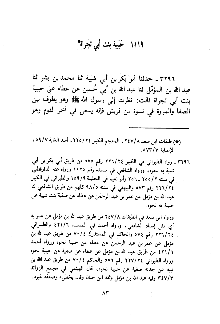 3296 - حَدَّثَنَا أَبُو بَكْرِ بْنُ أَبِي شَيْبَةَ , ثنا مُحَمَّدُ بْنُ بِشْرٍ , ثنا عَبْدُ اللَّهِ بْنُ الْمُؤَمَّلِ , ثنا عَبْدُ اللَّهِ بْنُ أَبِي حُسَيْنٍ , عَنْ عَطَاءٍ , عَنْ حَبِيبَةَ بِنْتِ أَبِي تَجْرَاةٍ , قَالَتْ: نَظَرْتُ إِلَى رَسُولِ اللَّهِ صَلَّى اللهُ عَلَيْهِ وَسَلَّمَ وَهُوَ يَطُوفُ بَيْنَ الصَّفَا وَالْمَرْوَةِ فِي نِسْوَةٍ مِنْ قُرَيْشٍ فَإِنَّهُ يَسْعَى فِي آخِرِ الْقَوْمِ وَهُوَ -[84]- يَقُولُ: §اسْعَوْا فَإِنَّ اللَّهَ كَتَبَ عَلَيْكُمُ السَّعْيَ قَالَتْ: فَنَظَرْتُ إِلَيْهِ وَإِنَّهُ يَسْعَى وَمُؤْتَزَرُهُ يَدُورُ مِنْ شِدَّةِ السَّعْيِ.