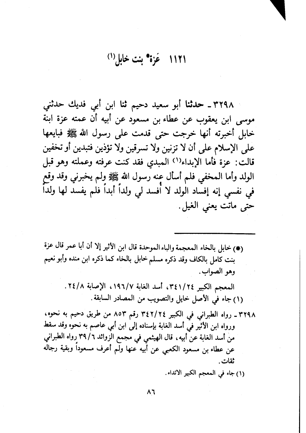 3298 - حَدَّثَنَا أَبُو سَعِيدٍ , دُحَيْمٌ ثَنا ابْنُ أَبِي فُدَيْكٍ , حَدَّثَنِي مُوسَى بْنُ يَعْقُوبَ , عَنْ عَطَاءِ بْنِ مَسْعُودٍ , عَنْ أَبِيهِ , أَنَّ عَمَّتَهُ عَزَّةَ ابْنَةَ خَابِلٍ أَخْبَرَتْهُ أَنَّهَا , خَرَجَتْ حَتَّى قَدِمَتْ عَلَى رَسُولِ اللَّهِ صَلَّى اللهُ عَلَيْهِ وَسَلَّمَ §فَبَايَعَهَا عَلَى الْإِسْلَامِ عَلَى أَنْ لَا تَزْنِينَ وَلَا تَسْرِقِينَ وَلَا تُؤْذِينَ فَتُبْدِينَ أَوْ تُخْفِينَ قَالَتْ عَزَّةُ: فَأَمَّا الْإِبْدَاءُ الْمَبْدِيُّ فَقَدْ كُنْتُ عَرَفْتُهُ وَعَمِلْتُهُ وَهُوَ قَبْلَ الْوَلَدِ وَأَمَّا الْمَخْفِيُّ فَلَمْ أَسْأَلْ عَنْهُ رَسُولَ اللَّهِ صَلَّى اللهُ عَلَيْهِ وَسَلَّمَ وَلَمْ يُخْبِرْنِي وَقَدْ وَقَعَ فِي نَفْسِي أَنَّهُ إِفْسَادُ الْوَلَدِ لَا أُفْسِدُ لِي وَلَدًا أَبَدًا فَلَمْ يُفْسِدْ لَهَا وَلَدًا حَتَّى مَاتَتْ يَعْنِي الْغَيْلَ.