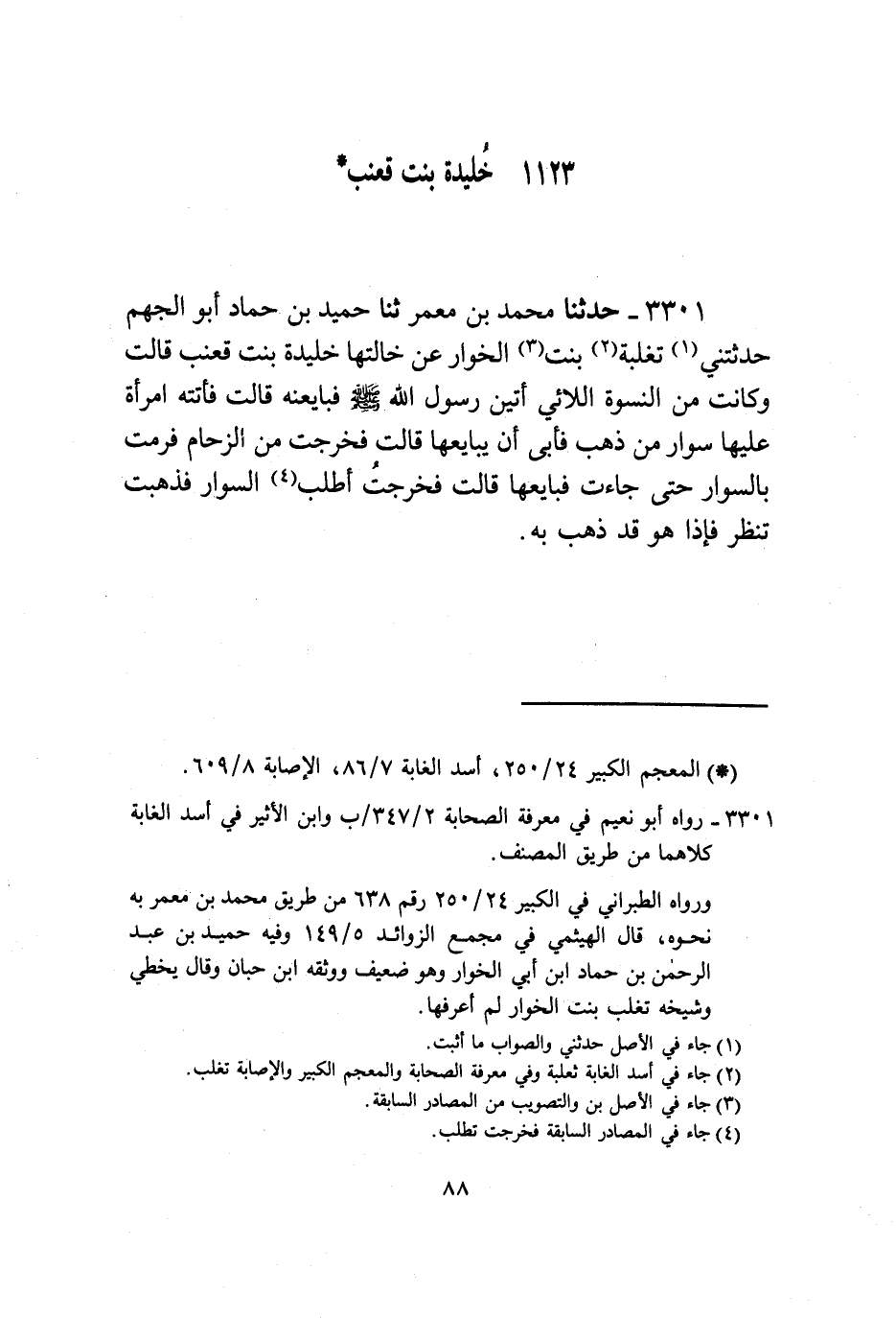 3301 - حَدَّثَنَا مُحَمَّدُ بْنُ مَعْمَرٍ , ثنا حُمَيْدُ بْنُ حَمَّادٍ أَبُو الْجَهْمِ , حَدَّثَتْنِي تَغْلِبُ بِنْتُ الْخَوَّارِ , عَنْ خَالَتِهَا خُلَيْدَةَ بِنْتِ قَعْنَبٍ قَالَتْ: وَكَانَتْ مِنَ النِّسْوَةِ اللَّائِي أَتَيْنَ رَسُولَ اللَّهِ صَلَّى اللهُ عَلَيْهِ وَسَلَّمَ فَبَايَعْنَهُ قَالَتْ: §فَأَتَتْهُ امْرَأَةٌ عَلَيْهَا سِوَارٌ مِنْ ذَهَبٍ فَأَبَى أَنْ يُبَايِعَهَا قَالَتْ: فَخَرَجَتْ مِنَ الزِّحَامِ فَرَمَتْ بِالسِّوَارِ حَتَّى جَاءَتْ فَبَايَعَهَا قَالَتْ: فَخَرَجْتُ أَطْلُبُ السِّوَارَ فَذَهَبَتْ تَنْظُرُ فَإِذَا هُوَ قَدْ ذُهِبَ بِهِ