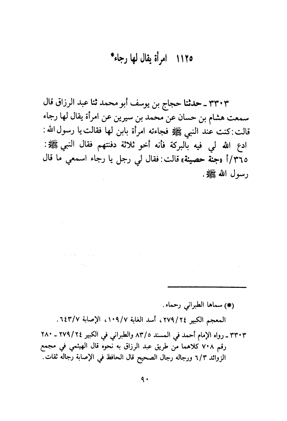 3303 - حَدَّثَنَا حَجَّاجُ بْنُ يُوسُفَ أَبُو مُحَمَّدٍ , ثَنا عَبْدُ الرَّزَّاقِ , قَالَ: سَمِعْتُ هِشَامَ بْنَ حَسَّانَ , عَنْ مُحَمَّدِ بْنِ سِيرِينَ , عَنِ امْرَأَةٍ , يُقَالُ لَهَا: رَجَاءُ قَالَتْ: كُنْتُ عِنْدَ النَّبِيِّ صَلَّى اللهُ عَلَيْهِ وَسَلَّمَ فَجَاءَتْهُ امْرَأَةٌ بِابْنٍ لَهَا فَقَالَتْ: يَا رَسُولَ اللَّهِ , ادْعُ اللَّهَ لِي فِيهِ بِالْبَرَكَةِ فَإِنَّهُ أَخُو ثَلَاثَةٍ دَفَنْتُهُمْ فَقَالَ النَّبِيُّ صَلَّى اللهُ عَلَيْهِ وَسَلَّمَ: «§جَنَّةٌ حَصِينَةٌ» قَالَتْ: فَقَالَ لِي رَجُلٌ: يَا رَجَاءُ اسْمَعِي مَا قَالَ رَسُولُ اللَّهِ صَلَّى اللهُ عَلَيْهِ وَسَلَّمَ.