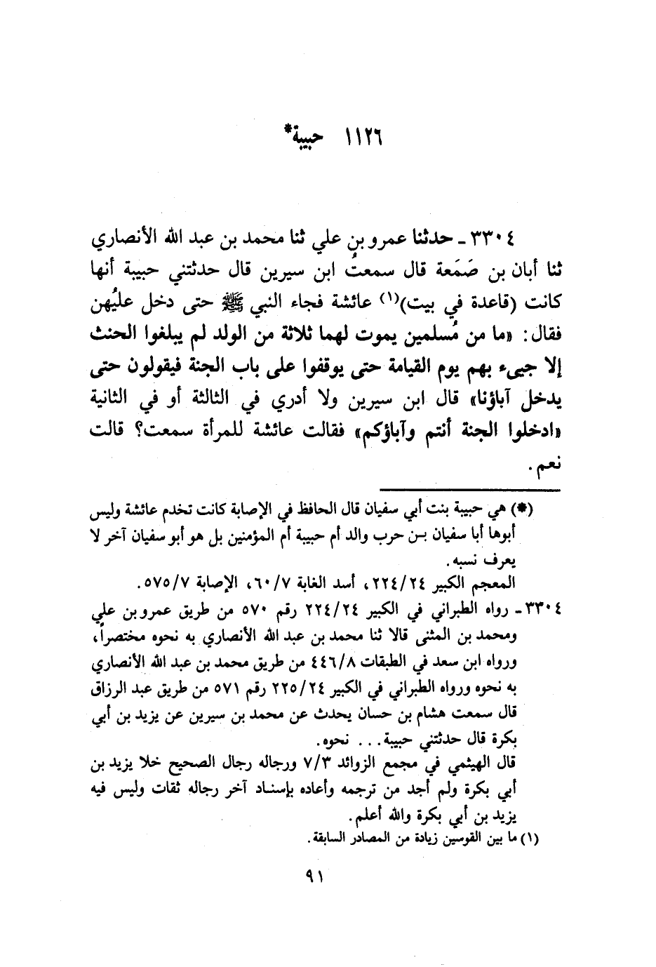 3304 - حَدَّثَنَا عَمْرُو بْنُ عَلِيٍّ , ثنا مُحَمَّدُ بْنُ عَبْدِ اللَّهِ الْأَنْصَارِيُّ , ثنا أَبَانُ بْنُ صَمْعَةَ , قَالَ: سَمِعْتُ ابْنَ سِيرِينَ , قَالَ: حَدَّثَتْنِي حَبِيبَةُ , أَنَّهَا كَانَتْ قَاعِدَةً فِي بَيْتِ عَائِشَةَ فَجَاءَ النَّبِيُّ صَلَّى اللهُ عَلَيْهِ وَسَلَّمَ حَتَّى دَخَلَ عَلَيْهِنَّ فَقَالَ: " §مَا مِنْ مُسْلِمَيْنِ يَمُوتُ لَهُمَا ثَلَاثَةٌ مِنَ الْوَلَدِ لَمْ يَبْلُغُوا الْحِنْثَ إِلَّا جِيءَ بِهِمْ يَوْمَ الْقِيَامَةِ حَتَّى يُوقَفُوا عَلَى بَابِ الْجَنَّةِ فَيَقُولُونَ: حَتَّى يَدْخُلَ آبَاؤُنَا " قَالَ ابْنُ سِيرِينَ: وَلَا أَدْرِي فِي الثَّالِثَةِ أَوْ فِي الثَّانِيَةِ ادْخُلُوا الْجَنَّةَ أَنْتُمْ وَآبَاؤُكُمْ فَقَالَتْ عَائِشَةُ لِلْمَرْأَةِ: سَمِعْتِ قَالَتْ: نَعَمْ.