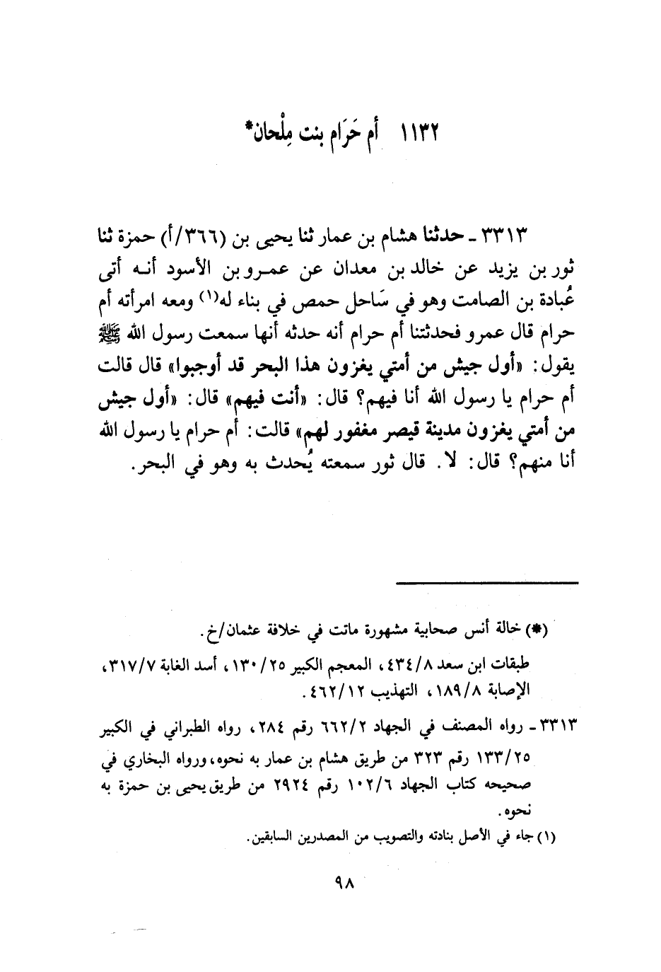 3313 - حَدَّثَنَا هِشَامُ بْنُ عَمَّارٍ , ثنا يَحْيَى بْنُ حَمْزَةَ , ثنا ثَوْرُ بْنُ يَزِيدَ , عَنْ خَالِدِ بْنِ مَعْدَانَ , عَنْ عَمْرِو بْنِ الْأَسْوَدِ , أَنَّهُ أَتَى عُبَادَةَ بْنَ الصَّامِتِ وَهُوَ فِي سَاحِلِ حِمْصَ فِي بِنَاءٍ لَهُ وَمَعَهُ امْرَأَتُهُ أُمُّ حَرَامٍ قَالَ عَمْرٌو: فَحَدَّثَتْنَا أُمُّ حَرَامٍ أَنَّهُ حَدَّثَهُ أَنَّهَا سَمِعَتْ رَسُولَ اللَّهِ صَلَّى اللهُ عَلَيْهِ وَسَلَّمَ يَقُولُ: §أَوَّلُ جَيْشٍ مِنْ أُمَّتِي يَغْزُونَ هَذَا الْبَحْرَ قَدْ أَوْجَبُوا قَالَ: قَالَتْ أُمُّ حَرَامٍ: يَا رَسُولَ اللَّهِ , أَنَا فِيهِمْ؟ قَالَ: أَنْتِ فِيهِمْ قَالَ: أَوَّلُ جَيْشٍ مِنْ أُمَّتِي يَغْزُونَ مَدِينَةَ قَيْصَرَ مَغْفُورٌ لَهُمْ قَالَتْ أُمُّ حَرَامٍ: يَا رَسُولَ اللَّهِ , أَنَا مِنْهُمْ؟ قَالَ: لَا. قَالَ ثَوْرٌ: سَمِعْتُهُ يُحَدِّثُ بِهِ وَهُوَ فِي الْبَحْرِ.