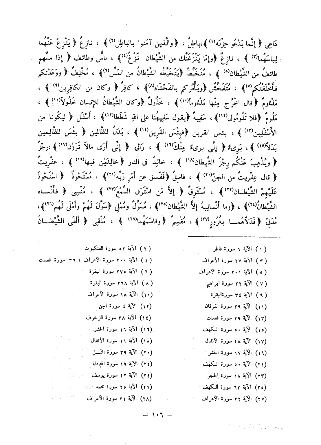 ، دَاعِى {إِنَّمَا يَدْعُواْ حِزْبَهُ} ، باطِلٌ، {والذين آمَنُواْ بالباطل} ، نازِعٌ {يَنزِعُ عَنْهُمَا لِبَاسَهُمَا} ، نازِغٌ {وَإِماَّ يَنَزَغَنَّكَ مِنَ الشيطان نَزْغٌ} ، ماسٌّ وطائف {إِذَا مَسَّهُمْ طَائِفٌ مِّنَ الشيطان} ، مُتَخَبِّطٌ {يَتَخَبَّطُهُ الشيطان مِنَ المس} ، مُخْلِفٌ {وَوَعَدتُّكُمْ فَأَخْلَفْتُكُمْ} ، مُتَفَحِّشٌ {وَيَأْمُرُكُم بالفحشآء} ؛ كافِرٌ {وَكَانَ مِنَ الكافرين} ، مَذْءُومٌ {قَالَ اخرج مِنْهَا مَذْءُوماً} ، خَذُولٌ {وَكَانَ الشيطان لِلإِنْسَانِ خَذُولاً} ، مَلُومٌ {فَلاَ تَلُومُونِي} ، سَفِيهٌ {يَقُولُ سَفِيهُنَا عَلَى الله شَطَطاً} ، أَسْفَل {لِيَكُونَا مِنَ الأسفلين} ، بئس القرين {فَبِئْسَ القرين} ، بَدَلٌ للظَّالمين {بِئْسَ لِلظَّالِمِينَ بَدَلاً} ، بَرِئٌ {إِنِّي برياء مِّنكَ} ، رَائى {إني أرى مَا لاَ تَرَوْنَ} ، رجْزٌ {وَيُذْهِبَ عَنكُمْ رِجْزَ الشيطان} ، خالِدٌ فى النار {خَالِدِينَ فِيهَا} ، عفْرِيتٌ {قَالَ عِفْرِيتٌ مِّن الجن} ، فاسِقٌ {فَفَسَقَ عَنْ أَمْرِ رَبِّهِ} ، مُسْتَحْوذٌ {استحوذ عَلَيْهِمُ الشيطان} ، مُسْتَرِقٌ {إِلاَّ مَنِ استرق السمع} . مُنْسِى {فَأَنْسَاهُ الشيطان} ، {وَمَآ أَنْسَانِيهُ إِلاَّ الشيطان} ، مُسَوِّلٌ ومُمْلِى {سَوَّلَ لَهُمْ وأملى لَهُمْ} ، مُدَلِىّ {فَدَلاَّهُمَا بِغُرُورٍ} ، مُقْسِمٌ {وَقَاسَمَهُمَآ} ، مُلْقِى {أَلْقَى الشيطان