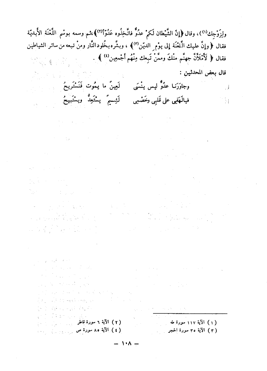 وَلِزَوْجِكَ} ، وقال {إِنَّ الشيطان لَكُمْ عَدُوٌّ فاتخذوه عَدُوّاً} ، ثم وسمه بوسْم اللَّعْنَة الأَبديّة فقال {وَإِنَّ عَلَيْكَ اللعنة إلى يَوْمِ الدين} ، وبشَّره بخُلود النَّار ومنْ تبعه من سائر الشياطين فقال {لأَمْلأَنَّ جَهَنَّمَ مِنكَ وَمِمَّن تَبِعَكَ مِنْهُمْ أَجْمَعِينَ} .