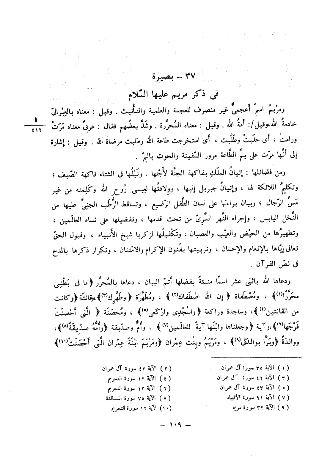 ودعاها الله باثنى عشر اسماً منبئةً بفضلها أَتمّ البيان، دعاها بالمُحرَّر {مَا فِي بَطْنِي مُحَرَّراً} ، ومُصْطَفاة {إِنَّ الله اصطفاك} ، ومُطَهَّرَة {وَطَهَّرَكِ} ، وقانتَة {وَكَانَتْ مِنَ القانتين} ، وساجدة وراكعة {واسجدي واركعي} ، ومُحصَنَة {التي أَحْصَنَتْ فَرْجَهَا} ، وآية {وَجَعَلْنَاهَا وابنهآ آيَةً لِّلْعَالَمِينَ} ، وأُمُّ وصدّيقة {وَأُمُّهُ صِدِّيقَةٌ} ، ووالدَةٌ {وَبَرّاً بِوَالِدَتِي} ، ومَرْيَمُ وبِنْت عِمْران {وَمَرْيَمَ ابنت عِمْرَانَ التي أَحْصَنَتْ}