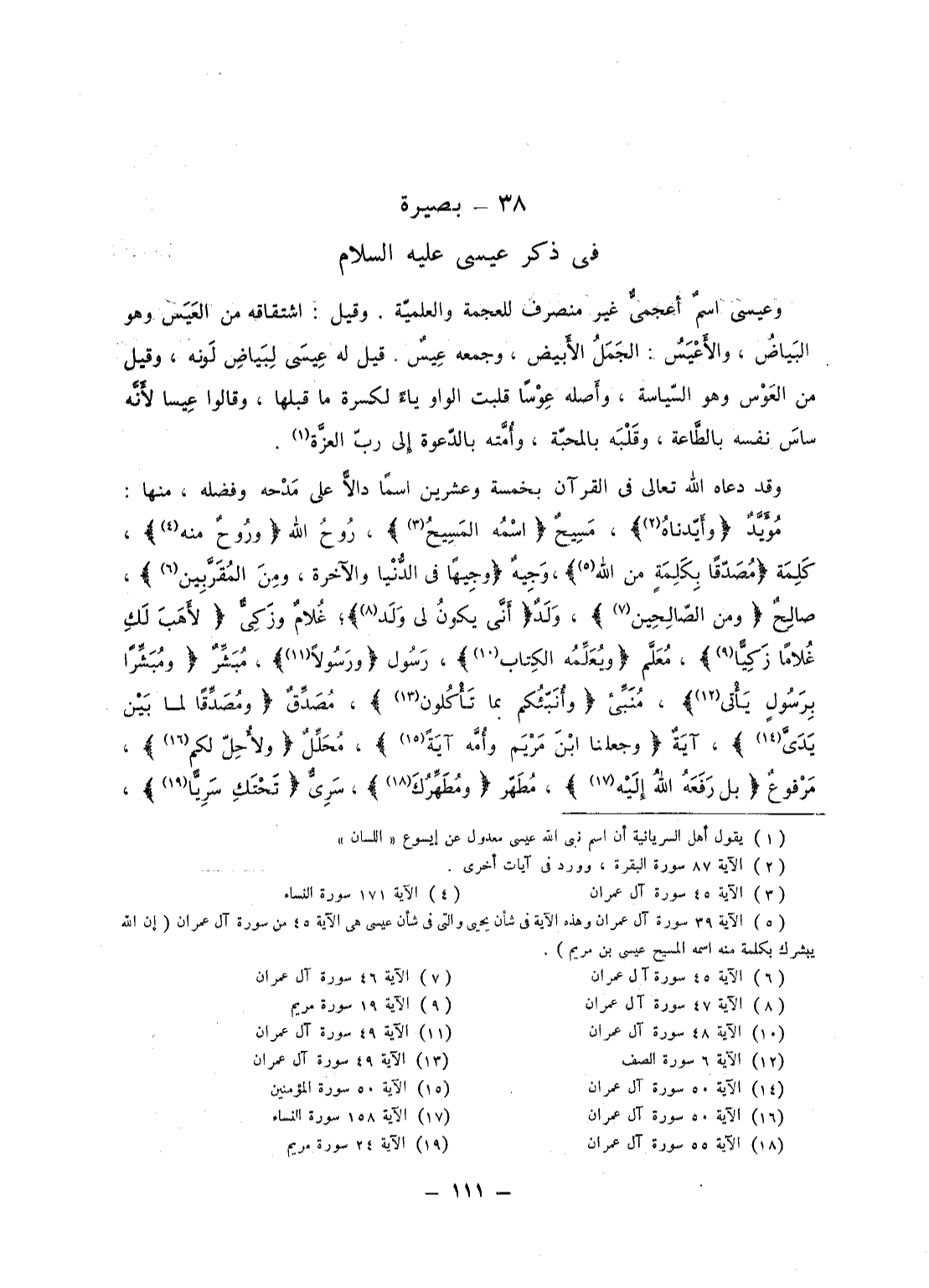 وعيسى اسمٌ أعجمىٌّ غير منصرف للعجمة والعلميّة. وقيل: اشتقاقه من العَيَس وهو البَياضُ، والأَعْيَسُ: الجَمَلُ الأَبيض، وجمعه عِيسٌ. قيل له عِيسَى لِبَياضِ لَونه، وقيل من العَوْس وهو السّياسة، وأَصله عِوْساً قلبت الواو ياءً لكسرة ما قبلها، وقالوا عِيسا لأَنَّه ساسَ نفسه بالطَّاعة، وقَلْبَه بالمحبّة، وأُمَّته بالدّعوة إِلى ربّ العزَّة.