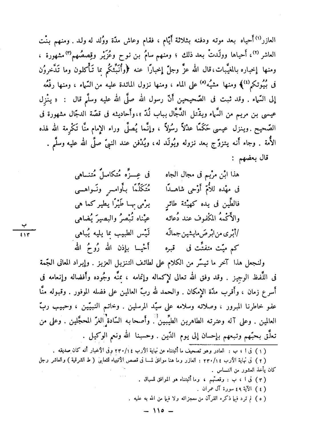 العازر أَحياه بعد موته ودفنه بثلاثة أَيّام، فقام وعاش مدّة ووُلد له ولد. ومنهم بنْت العاشر، أَحياها وولَدتْ بعد ذلك؛ ومنهم سامُ بن نوح وعُزَيْر وقِصصُهم مشهورة، ومنها إِخباره بالمغيِّبات، قال الله عزَّ وجلّ إِخباراً عنه {وَأُنَبِّئُكُمْ بِمَا تَأْكُلُونَ وَمَا تَدَّخِرُونَ فِي بُيُوتِكُمْ} ومنها مشيُه على الماء، ومنها نزول المائدة عليه من السّماء، ومنها رفْعُه إِلى السّماء. وقد ثبت فى الصّحيحين أَنّ رسول الله صلَّى الله عليه وسلَّم قال: "ينْزِل عيسى بن مريم من السَّماء ويقْتل الدَّجَّال بباب لُدّ"، وأَحاديثه فى قصّة الدجّال مشهورة فى الصّحيح. وينزل عيسى حَكَماً عدْلاً رسُولاً، وإِنَّما يُصلِّى وراء الإِمام منَّا تَكْرِمة الله لهذه الأُمة. وجاء أَنه يتزوّج بعد نزوله ويُولَد له، ويُدْفن عند النبىّ صلَّى الله عليه وسلَّم.