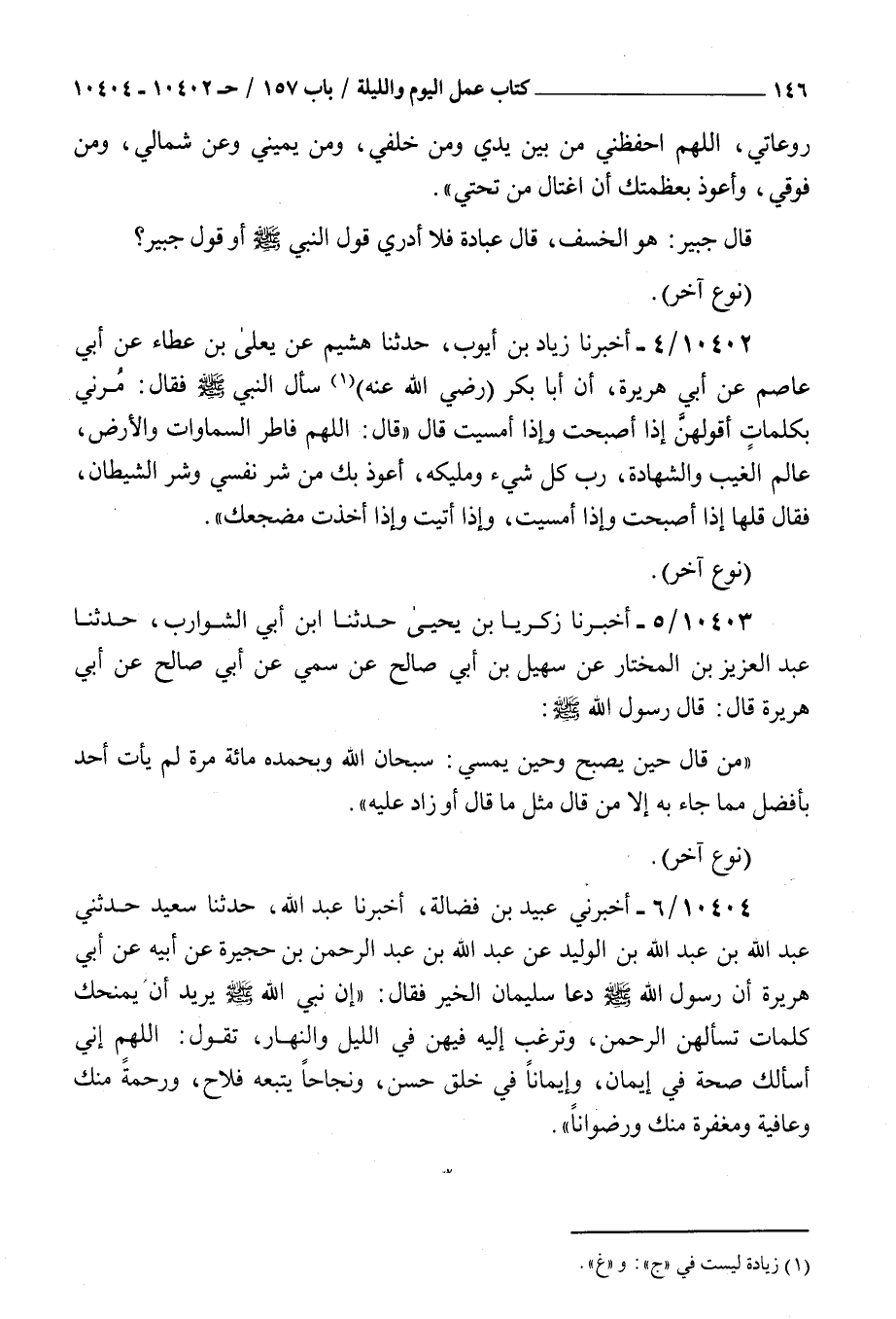 10402 - أخبرنا زياد بن أيوب حدثنا هشيم عن يعلى بن عطاء عن أبي عاصم عن أبي هريرة : أن أبا بكر رضي الله عنه سأل النبي صلى الله عليه و سلم فقال مرني بكلمات أقولهن إذا أصبحت وإذا أمسيت قال قال اللهم فاطر السماوات والأرض عالم الغيب والشهادة رب كل شيء ومليكه أعوذ بك من شر نفسي وشر الشيطان فقال قلها إذا أصبحت وإذا أمسيت وإذا أتيت وإذا أخذت مضجعك نوع آخر
