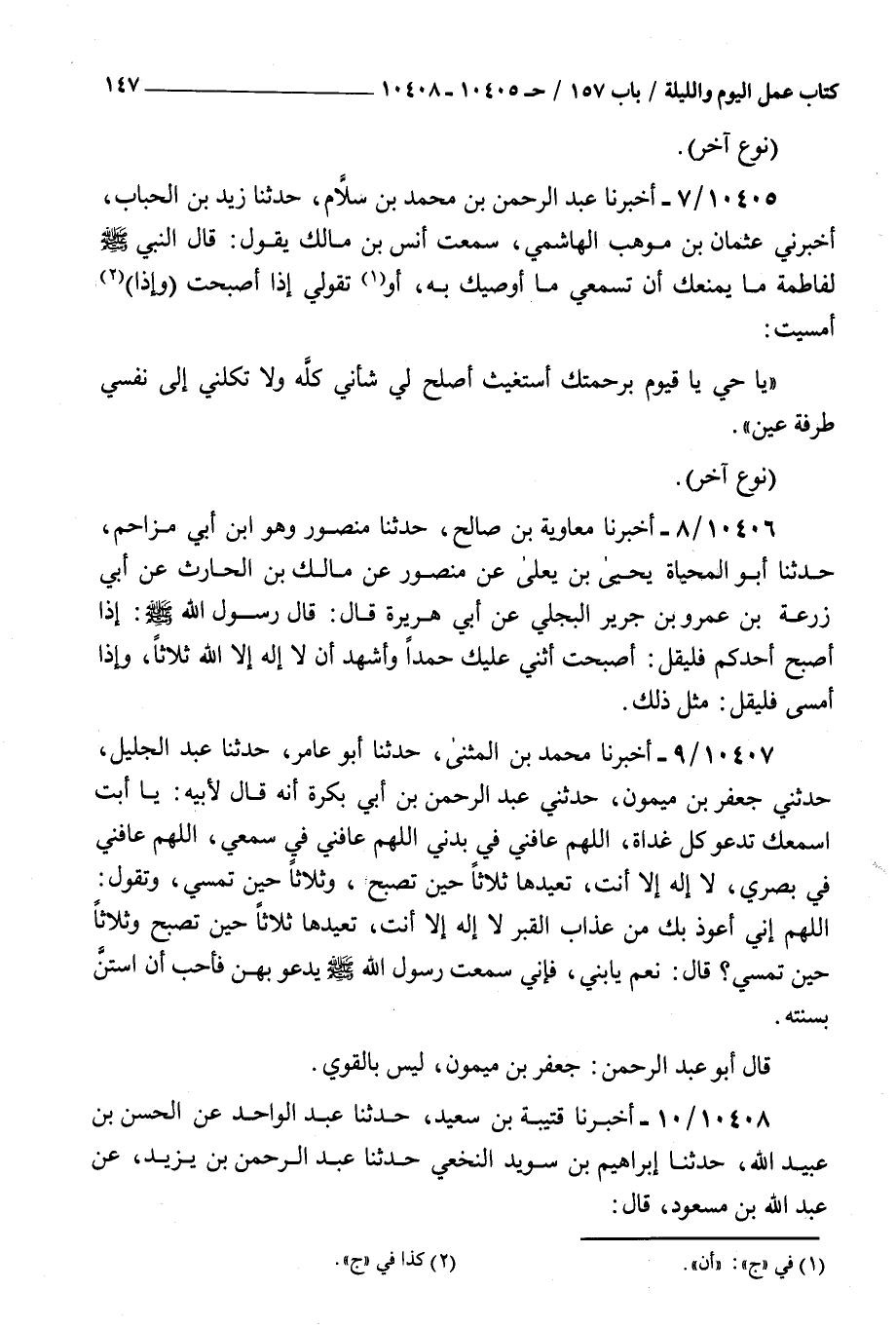 10407 - أخبرنا محمد بن المثنى حدثنا أبو عامر حدثنا عبد الجليل حدثني جعفر بن ميمون حدثني عبد الرحمن بن أبي بكرة أنه قال لأبيه : يا أبت أسمعك تدعو كل غداة اللهم عافني في بدني اللهم عافني في سمعي اللهم عافني في بصري لا إله إلا أنت تعيدها ثلاثا حين تصبح وثلاثا حين تمسي وتقول اللهم إني أعوذ بك من عذاب القبر لا إله إلا أنت تعيدها ثلاثا حين تصبح وثلاثا حين تمسي قال نعم يا بني فإني سمعت رسول الله صلى الله عليه و سلم يدعو بهن فأحب أن استن بسنته قال أبو عبد الرحمن جعفر بن ميمون ليس بالقوي