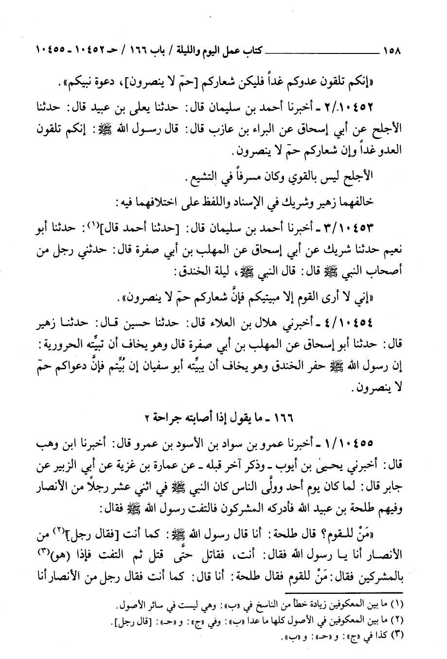 10453 - أخبرنا أحمد بن سليمان قال حدثنا أحمد قال حدثنا أبو نعيم حدثنا شريك عن أبي إسحاق عن المهلب بن أبي صفرة قال حدثني رجل من أصحاب النبي صلى الله عليه و سلم قال : قال النبي صلى الله عليه و سلم ليلة الخندق إني لا أرى القوم إلا مبيتيكم فإن شعاركم حم لا ينصرون
