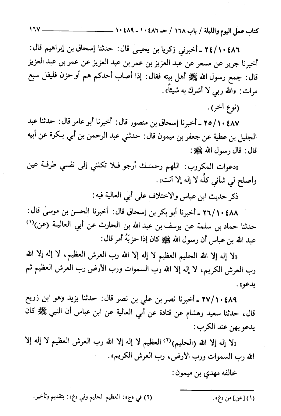 10488 - أخبرنا أبو بكر بن إسحاق قال أخبرنا الحسن بن موسى قال حدثنا حماد بن سلمة عن يوسف بن عبد الله بن الحارث عن أبي العالية عن عبد الله بن عباس : أن رسول الله صلى الله عليه و سلم كان إذا حزبه أمر قال لا إله إلا الله الحليم العظيم لا إله إلا الله رب العرش العظيم لا إله إلا الله رب العرش الكريم لا إله إلا الله رب السماوات ورب الأرض رب العرش العظيم ثم يدعو