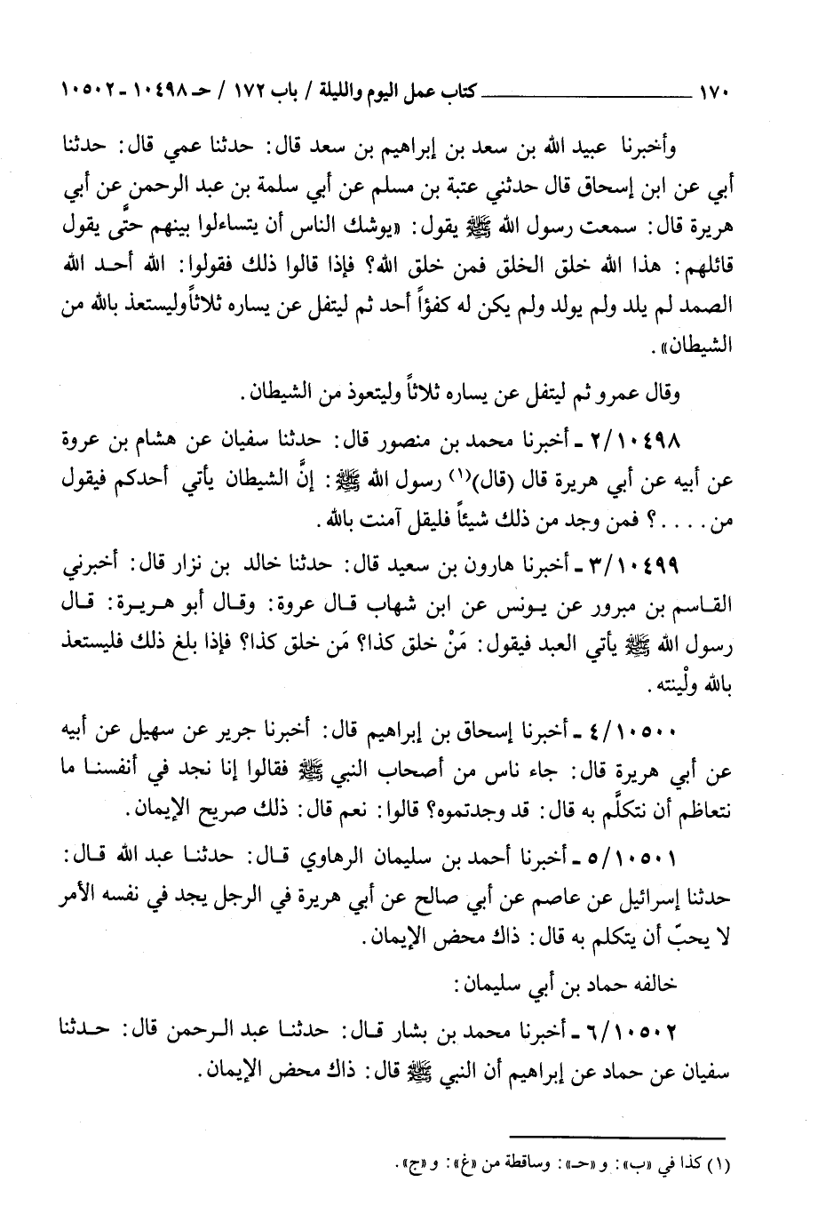 10498 - أخبرنا محمد بن منصور قال حدثنا سفيان عن هشام بن عروة عن أبيه عن أبي هريرة قال قال رسول الله صلى الله عليه و سلم : إن الشيطان يأتي أحدكم فيقول من فمن وجد من ذلك شيئا فليقل آمنت بالله