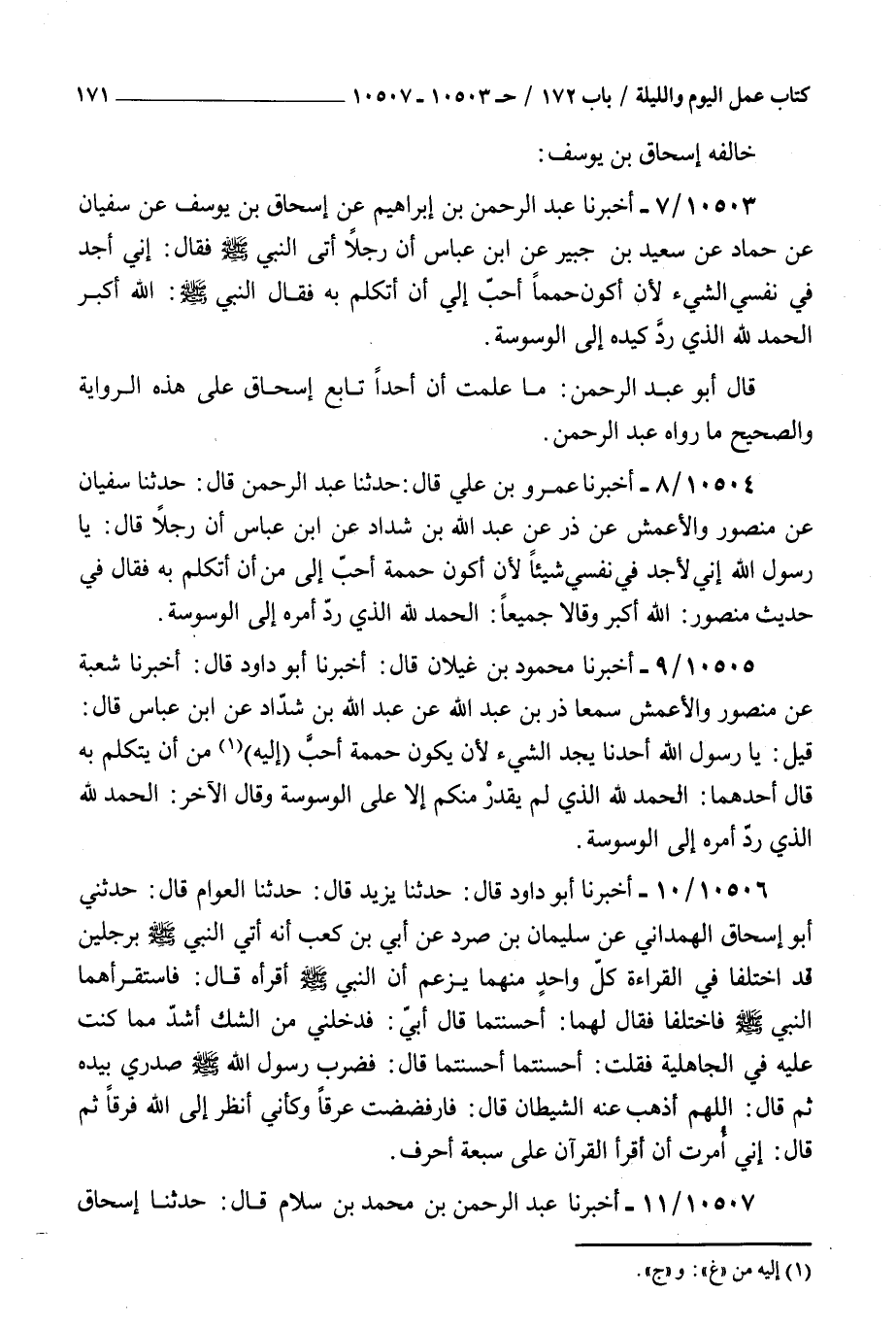 10503 - أخبرنا عبد الرحمن بن إبراهيم عن إسحاق بن يوسف عن سفيان عن حماد عن سعيد بن جبير عن بن عباس : أن رجلا أتى النبي صلى الله عليه و سلم فقال إني أجد في نفسي الشيء لأن أكون حمما أحب إلي أن أتكلم به فقال النبي صلى الله عليه و سلم الله أكبر الحمد لله الذي رد كيده إلى الوسوسة قال أبو عبد الرحمن ما علمت أن أحدا تابع إسحاق على هذه الرواية والصحيح ما رواه عبد الرحمن
