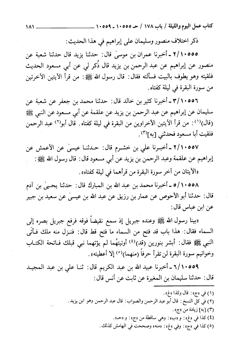 10555 - أخبرنا عمران بن موسى قال حدثنا يزيد قال حدثنا شعبة عن منصور عن إبراهيم عن عبد الرحمن بن يزيد قال ذكر لي عن أبي مسعود الحديث فلقيته وهو يطوف بالبيت فسألته فقال قال رسول الله صلى الله عليه و سلم : من قرأ الآيتين الآخرتين من سورة البقرة في ليلة كفتاه