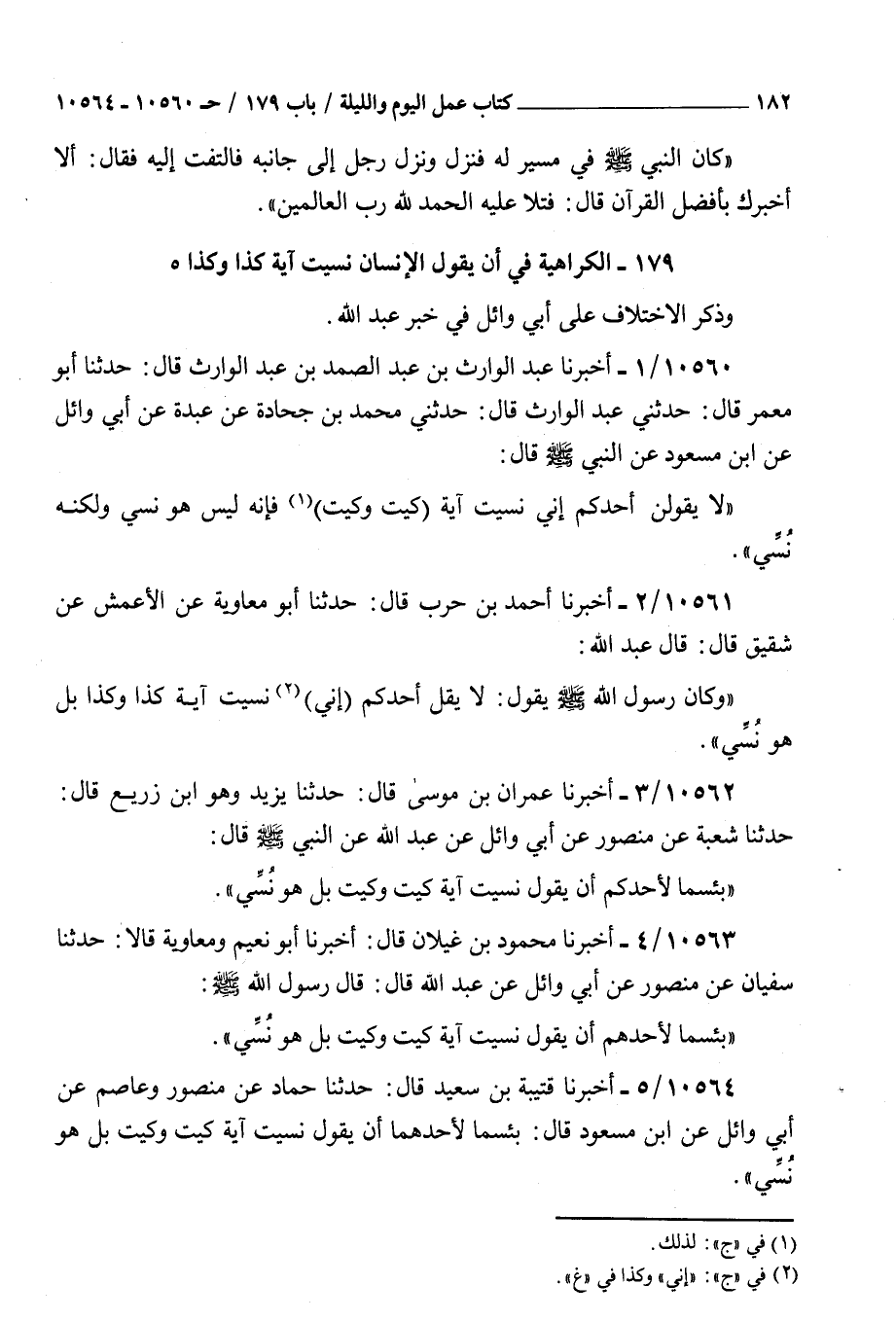 10563 - أخبرنا محمود بن غيلان قال أخبرنا أبو نعيم ومعاوية قالا حدثنا سفيان عن منصور عن أبي وائل عن عبد الله قال قال رسول الله صلى الله عليه و سلم : بئسما لأحدهم أن يقول نسيت آية كيت وكيت بل هو نسي